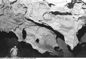 Moonmilk is common in the caves. Possibly a result of the porous host rock S9503-03.5L1.MoonMilk.jpg |