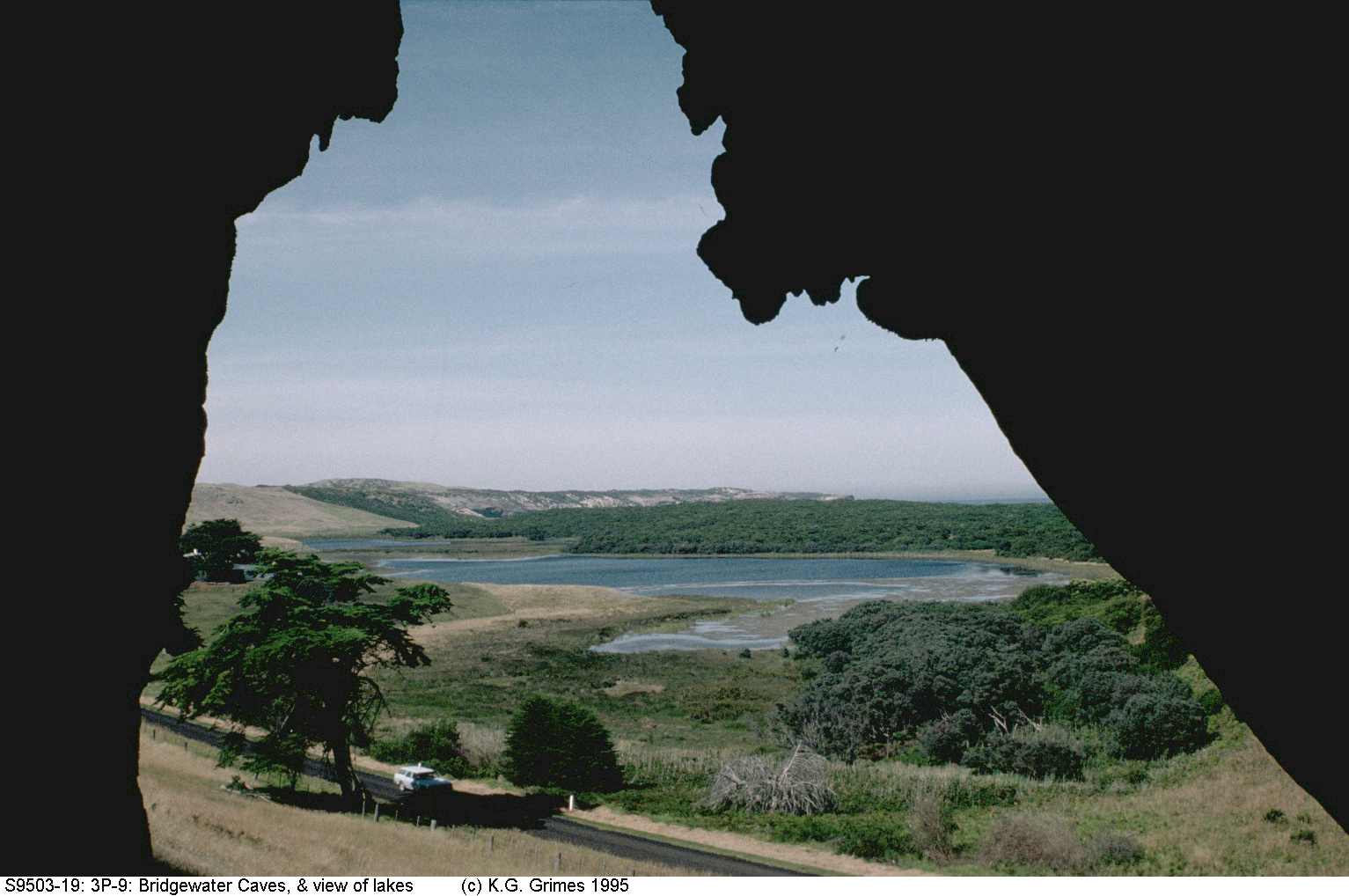 The Bridgewater Lakes (behind a dune barrier) and distant Cape Bridgewater (dune limestone over volcanics), Victoria