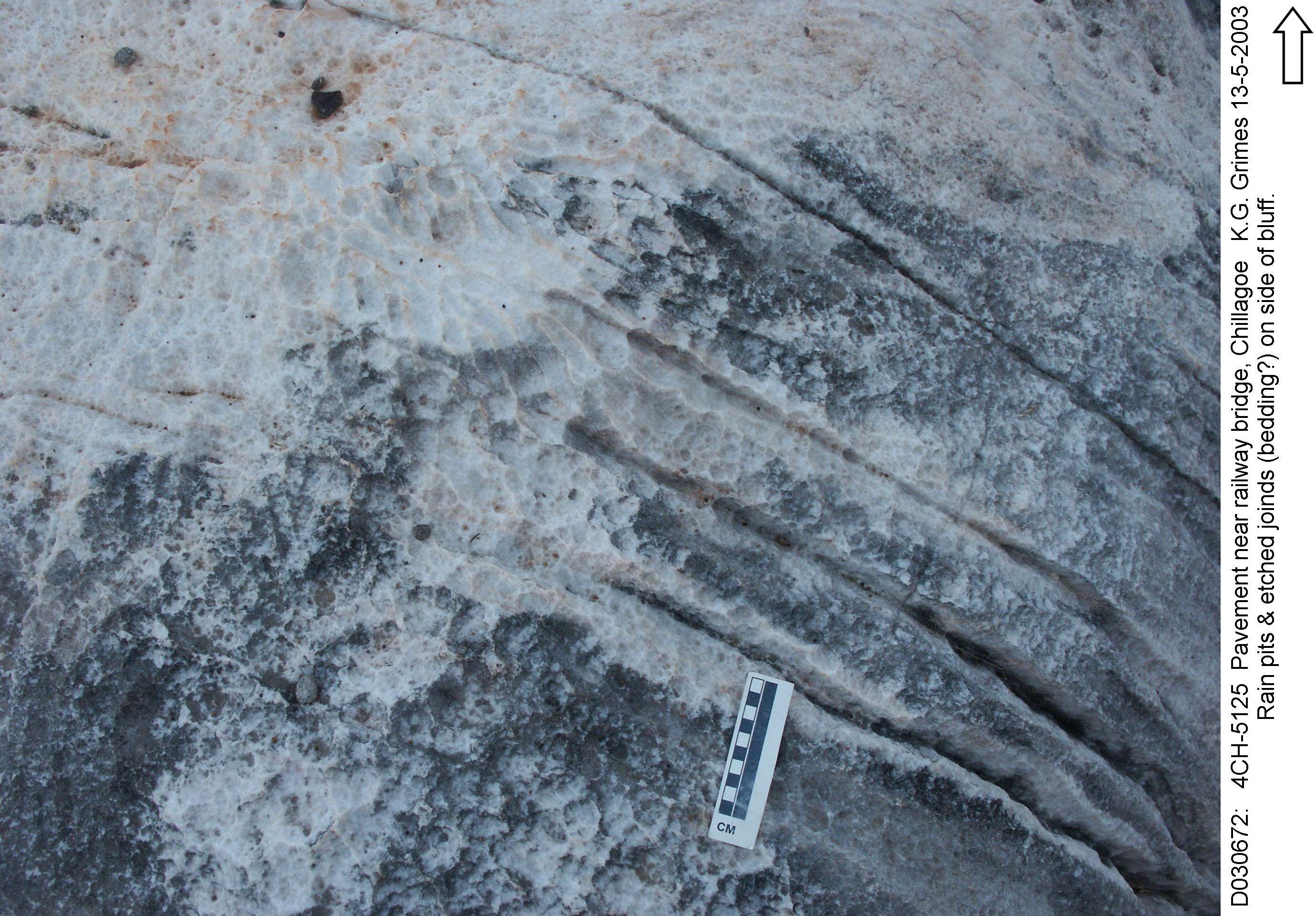 "Rain-pits" and etched joints (or vertical bedding?) on the side of a bluff. File: D030672.jpg |