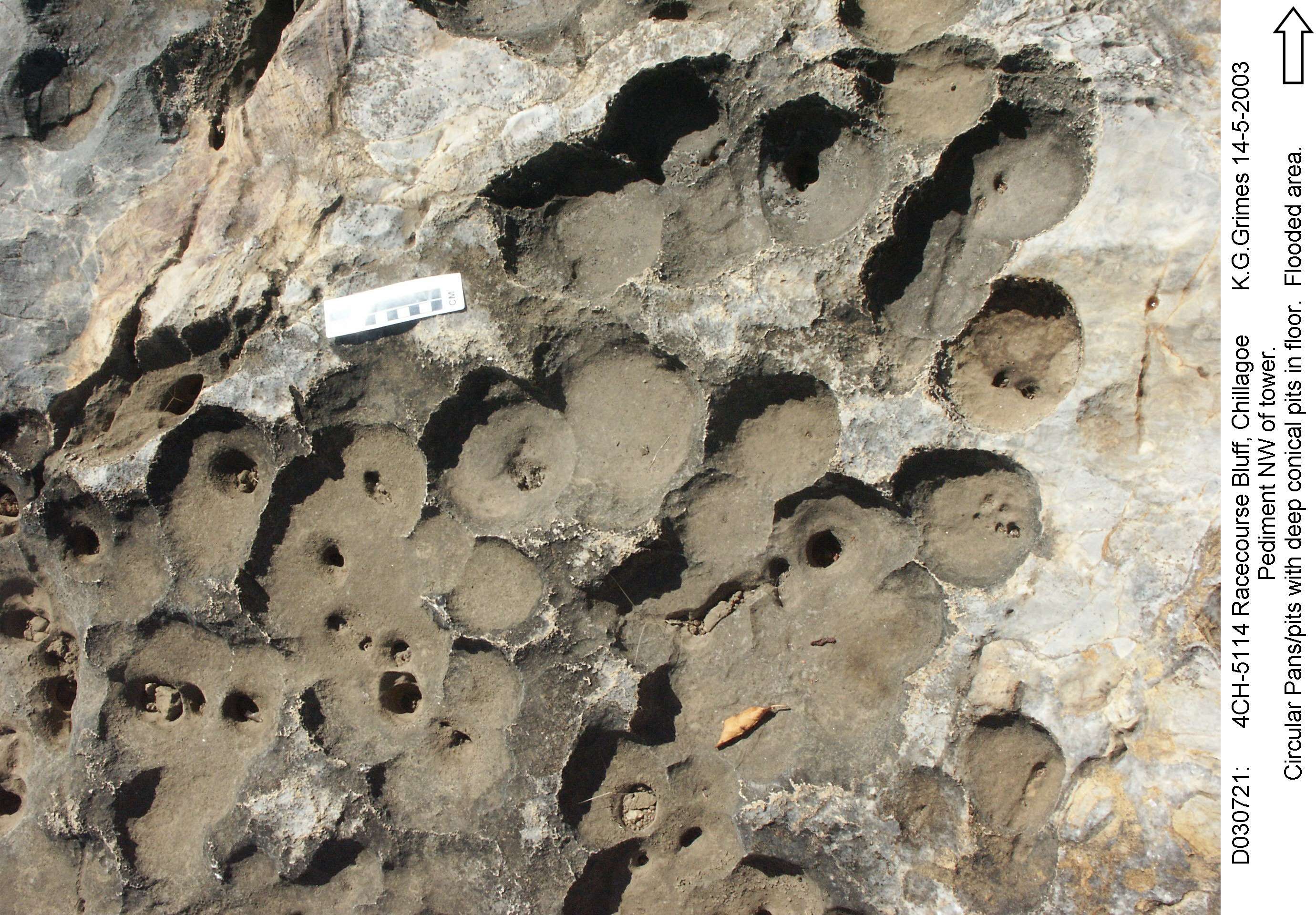 Pan with deep conical pits in floor. A pediment that is flooded regularly. Stereo-pair - view cross-eyed. File: D030720.jpg and ..719 |