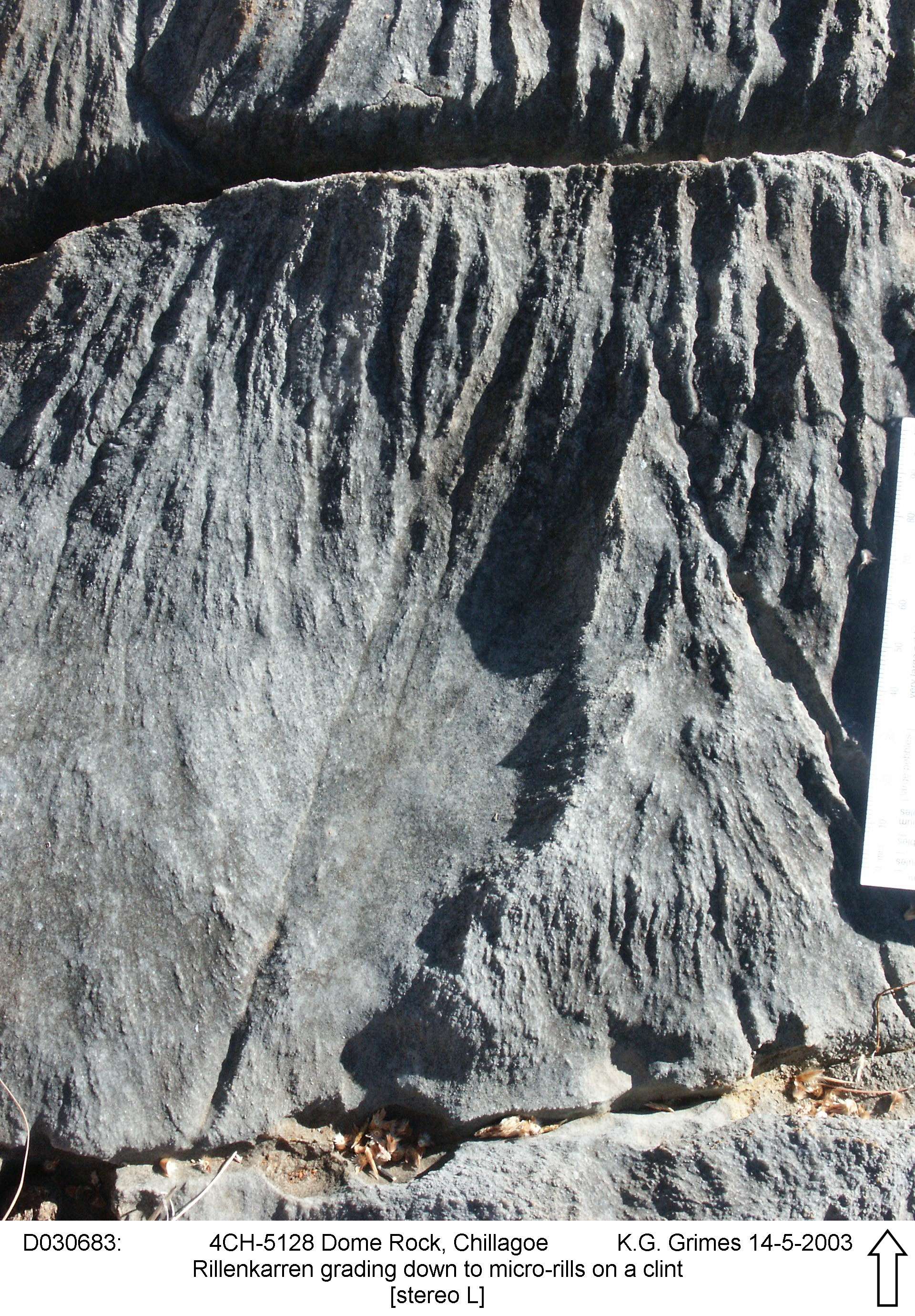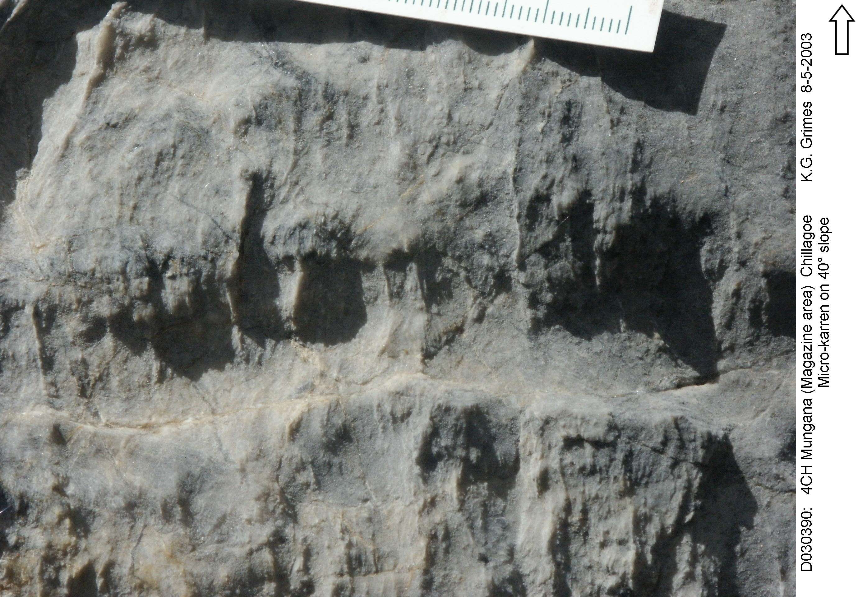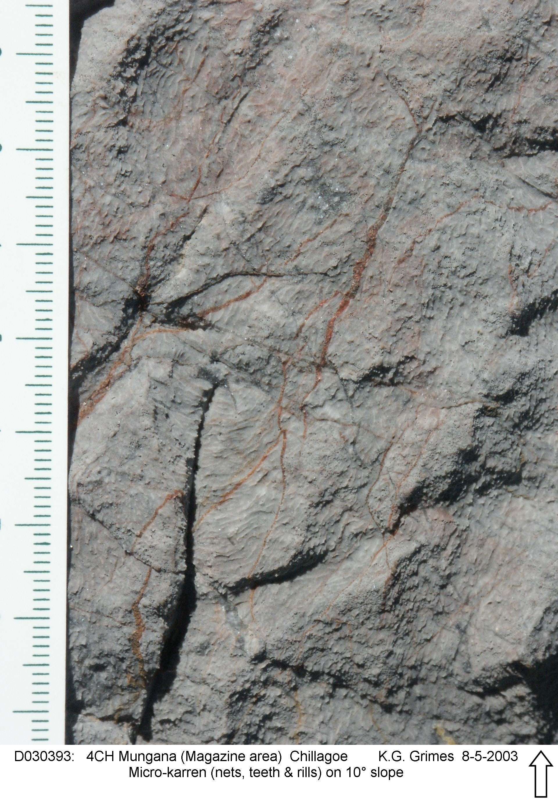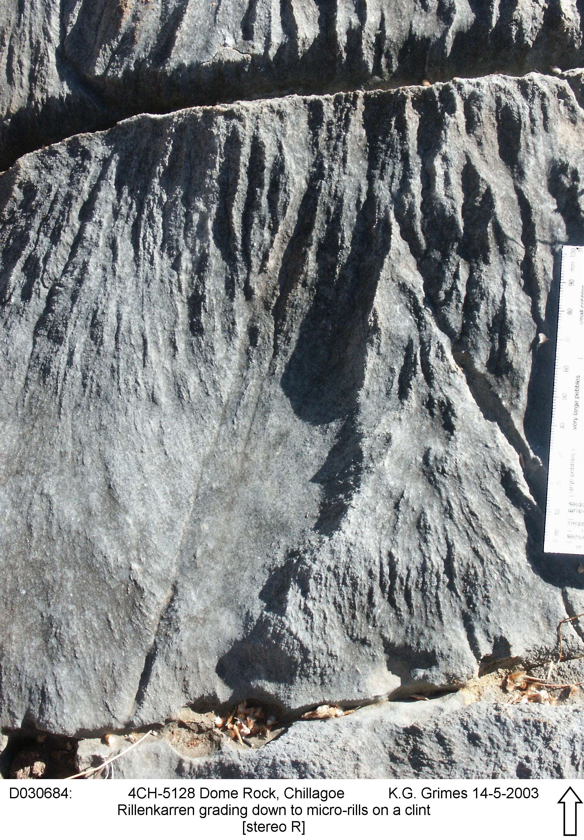 Rillenkarren grading down to a smooth 60° slope. Micro-rills occur within some rillenkarren. File: D030685.jpg |