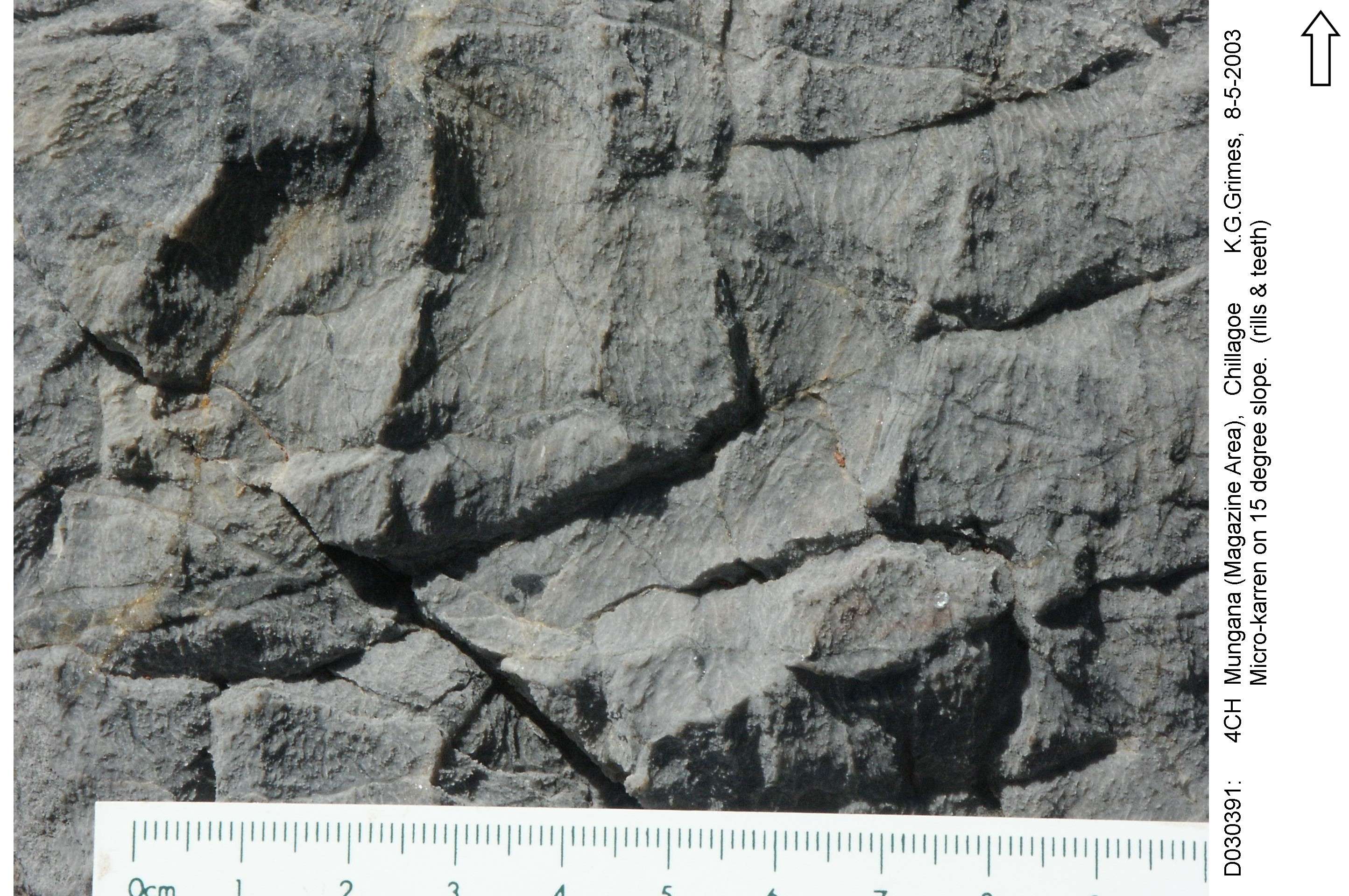 Micro-karren (rasp-like teeth and some pits), on a gentle slope. File: D030779.jpg |