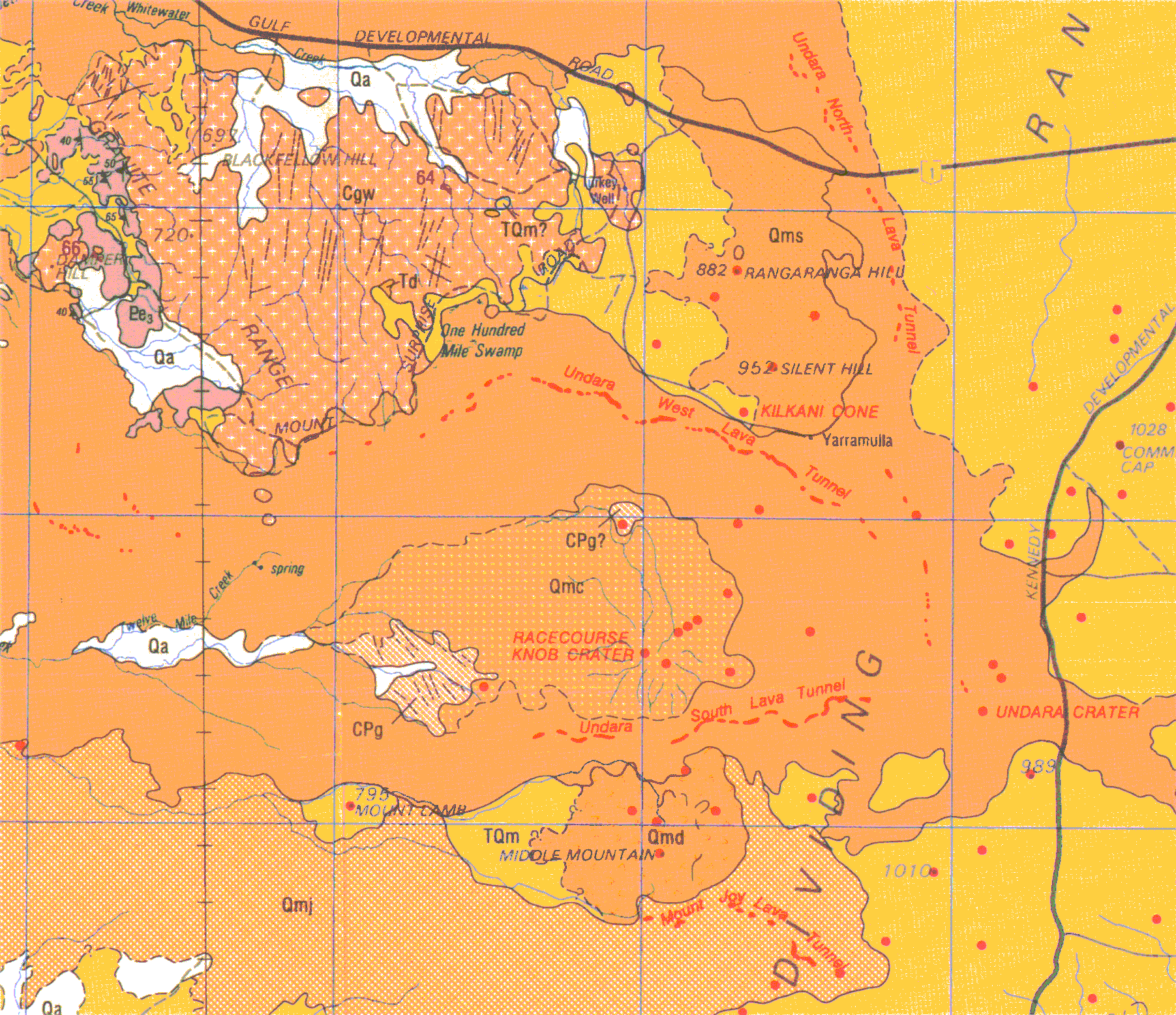 Filled red circles are volcanic centres. The lines of smaller red dots are depressions that trace the major lava tubes, but not all these are drained and open. Most of the open tubes are in the "Undara West Lava Tunnel".