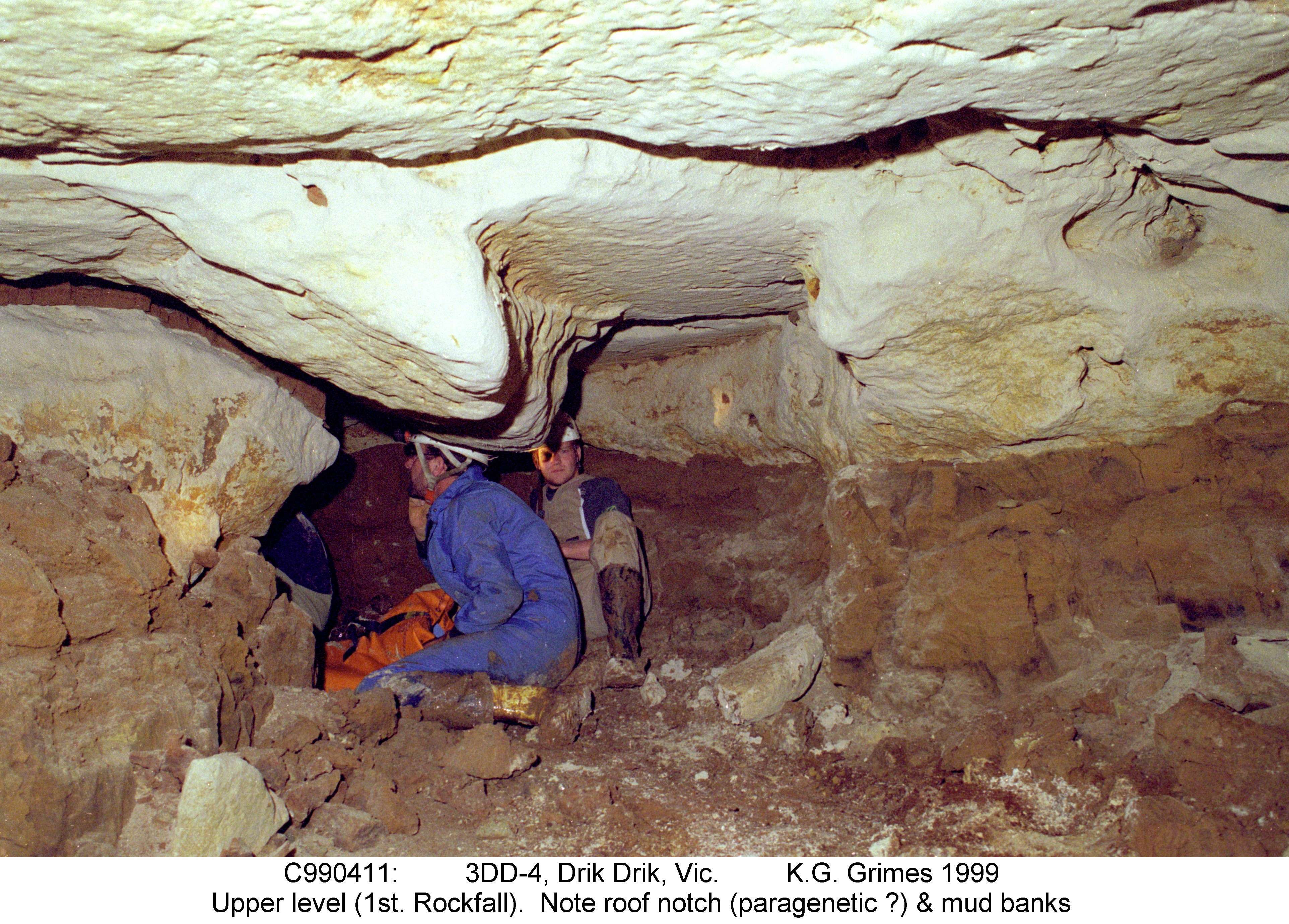 3DD-4: Upper level above 1st rockfall. Note roof notch (paragenetic?) and old mud banks. File: C990411.jpg |