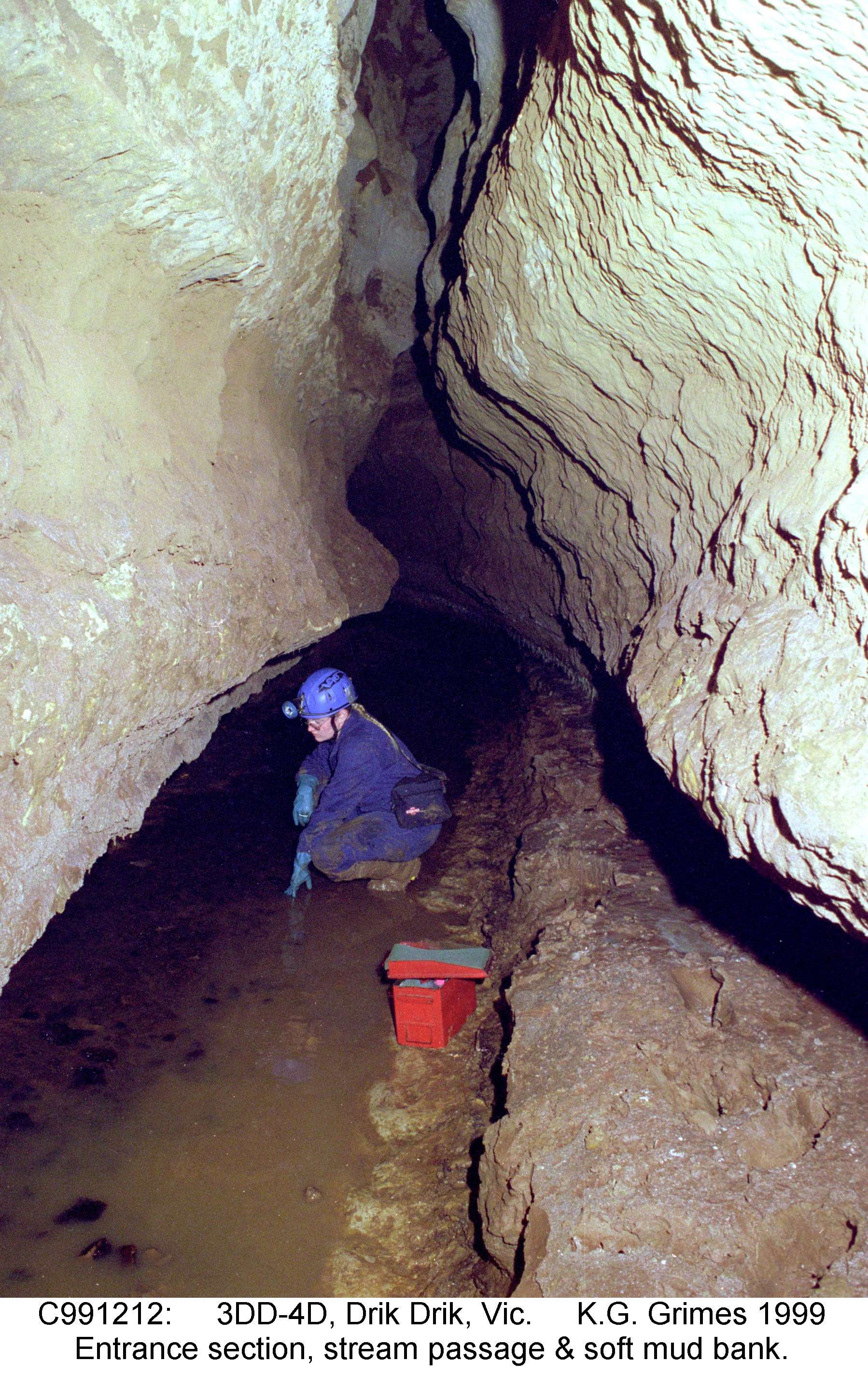3DD-4: Entrance section. Stream passage. Soft mud bank. Erica looking for shark's teeth ! File: C991212.jpg |