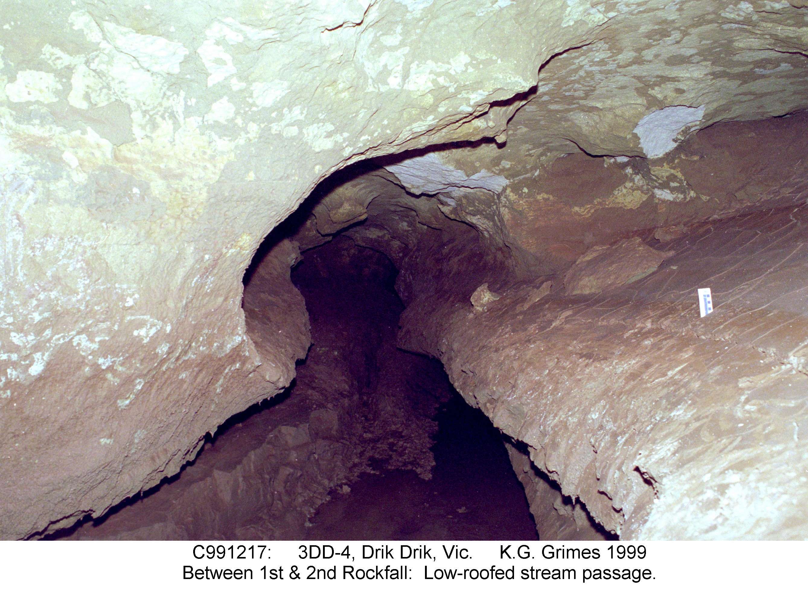 3DD-4: Between 1st & 2nd Rockfall. Low-roofed stream passage. Mud bank on right with cracks. File: C991217.jpg |