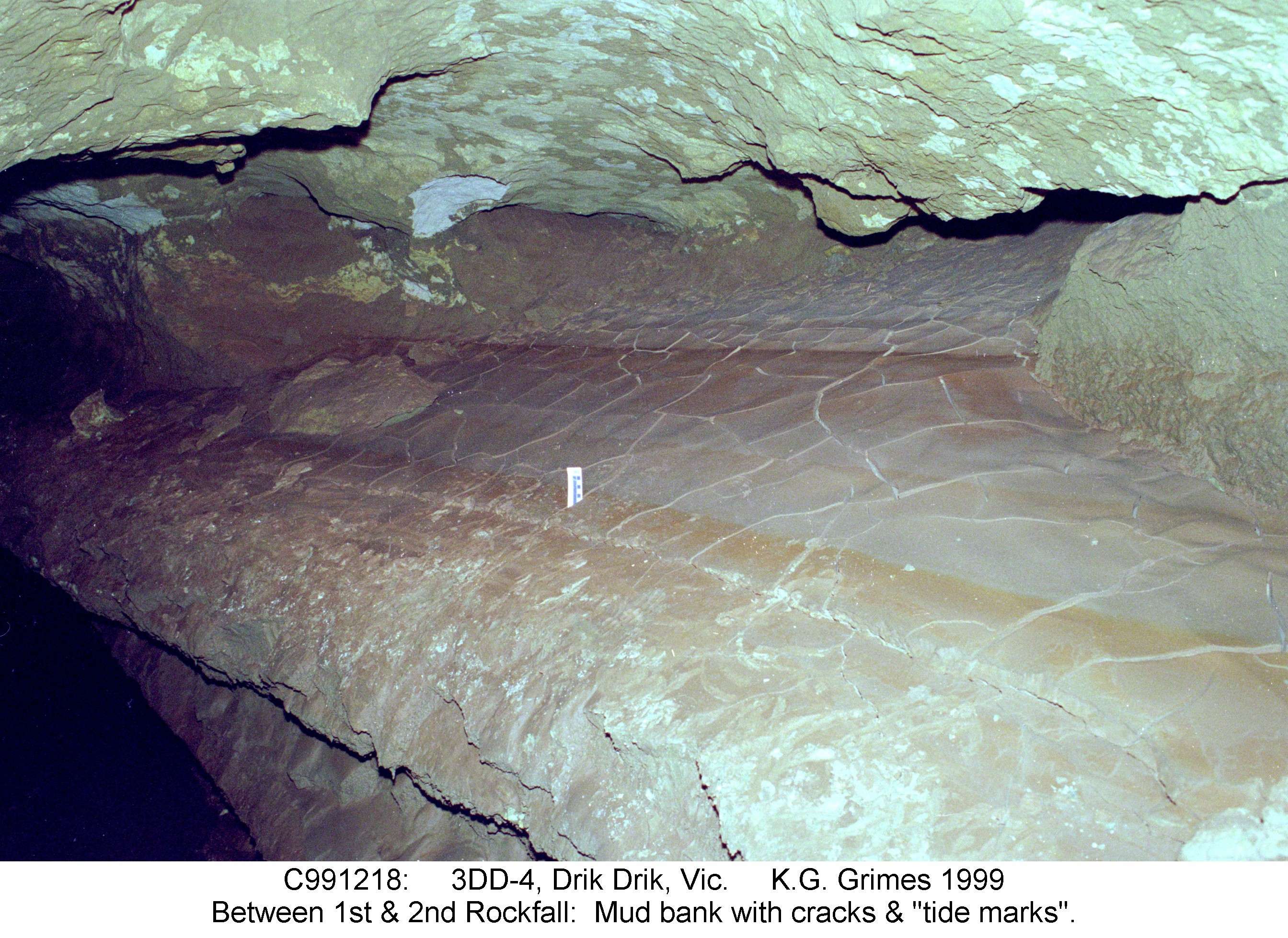 3DD-4: Between 1st and 2nd rockfalls. Mud bank with dessication cracks. File: C991218.jpg |