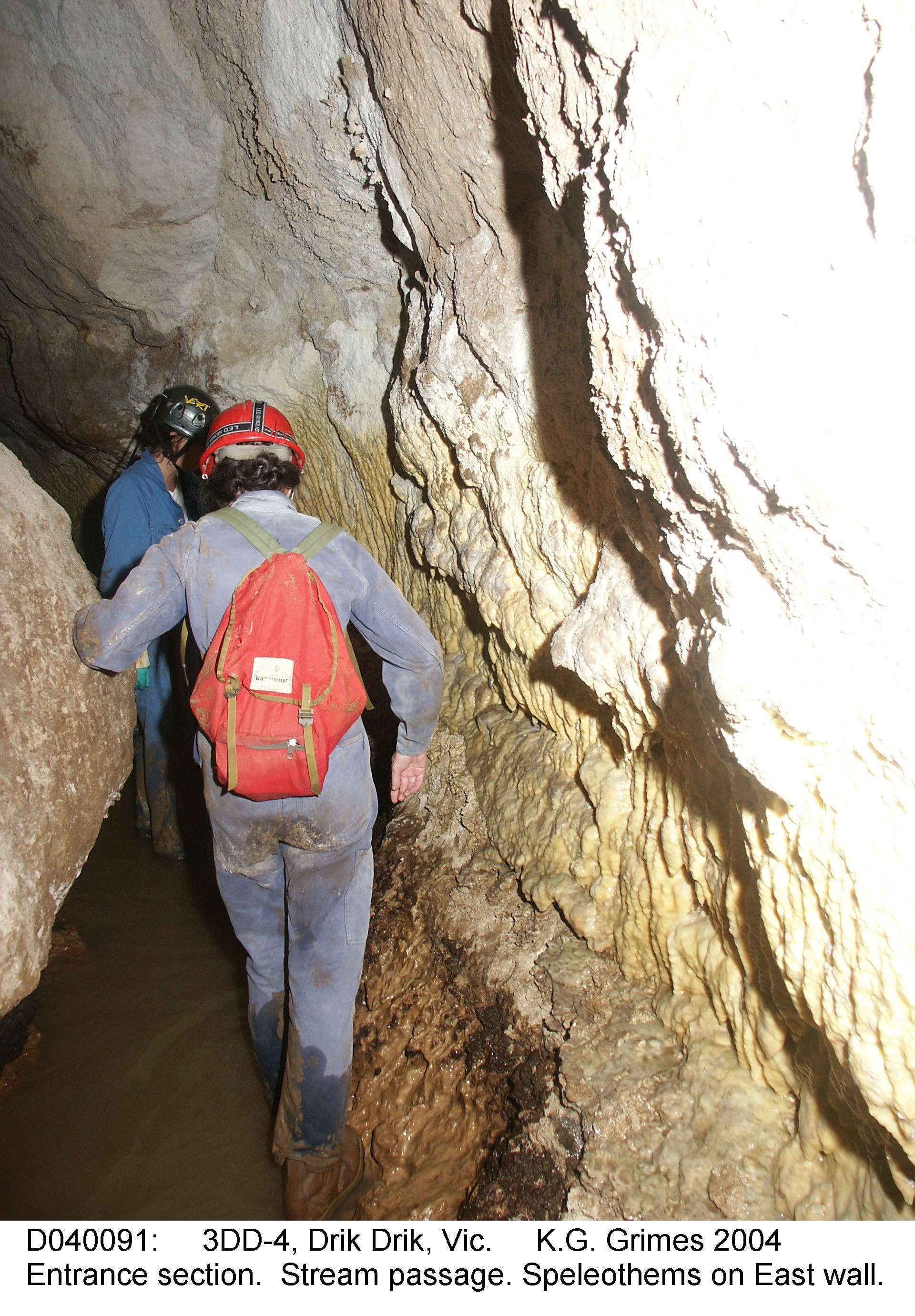 3DD-4: Entrance section. Stream passage. Speleothems on east (right) wall. File: D040091.jpg |