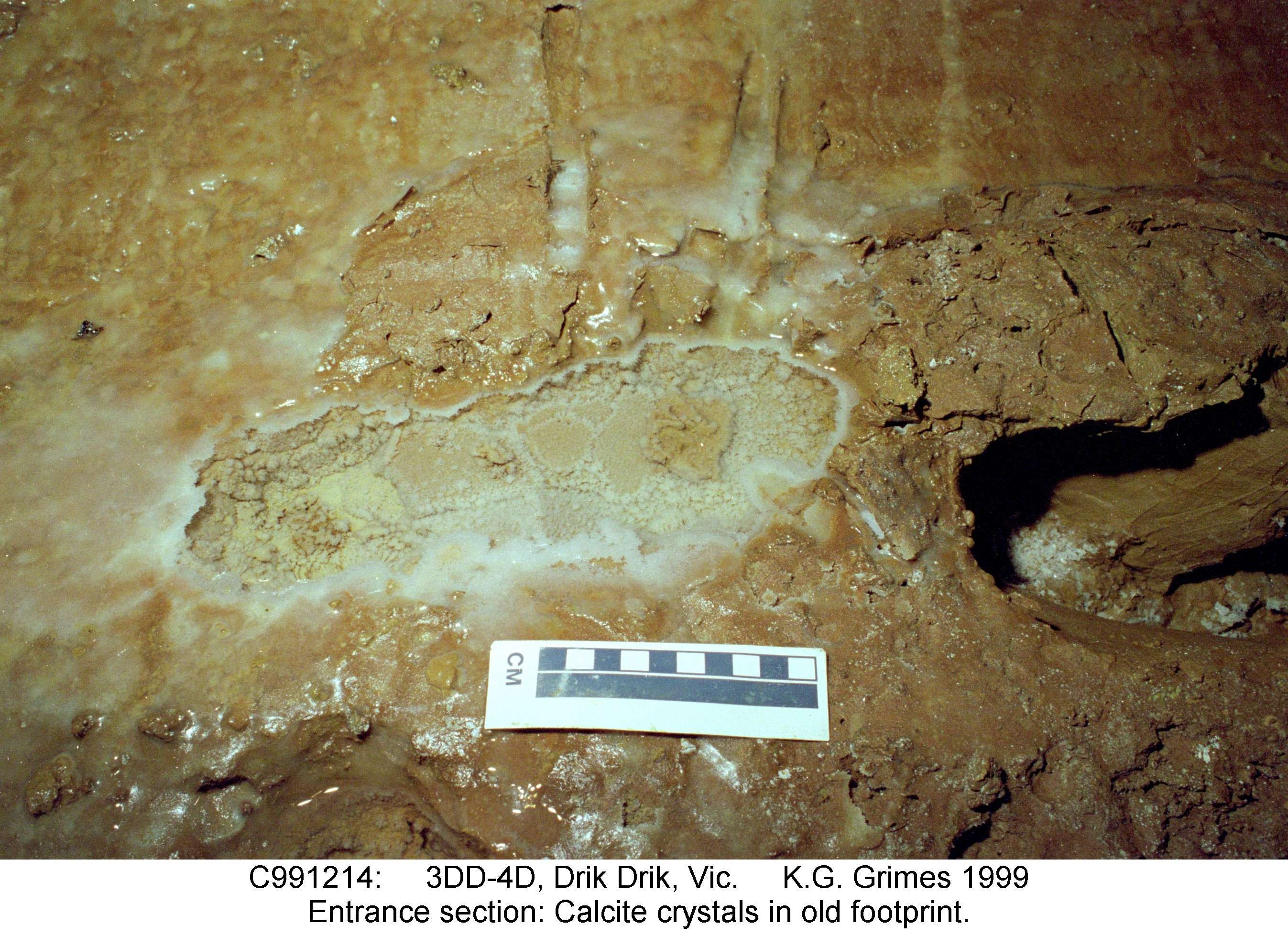 3DD-4: Entrance section. Old footprint - with calcite crystal growths. Taken in 1999, the age of the footprint is uncertain but predates the current exploration which began in 1995. File: C991214.jpg |