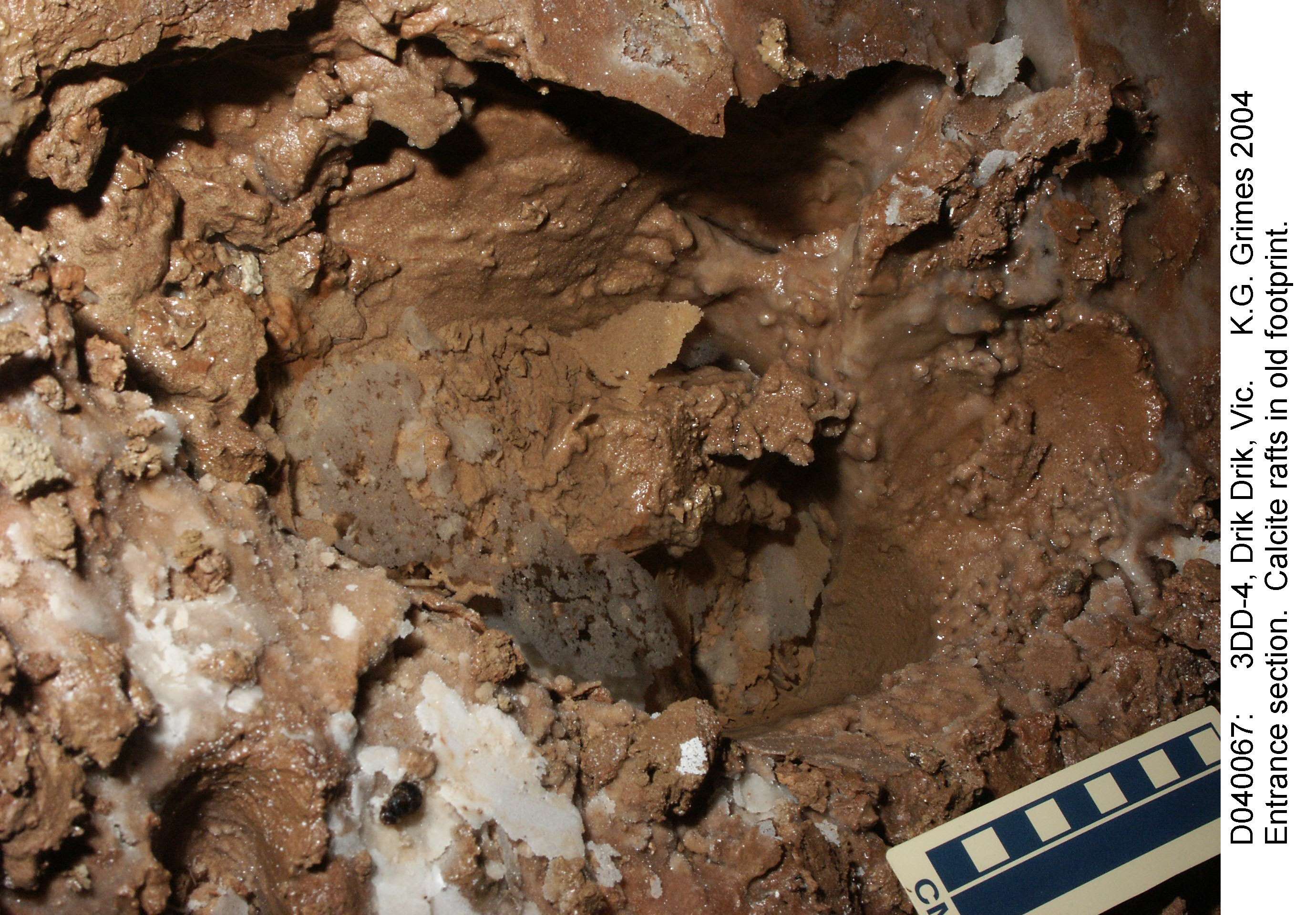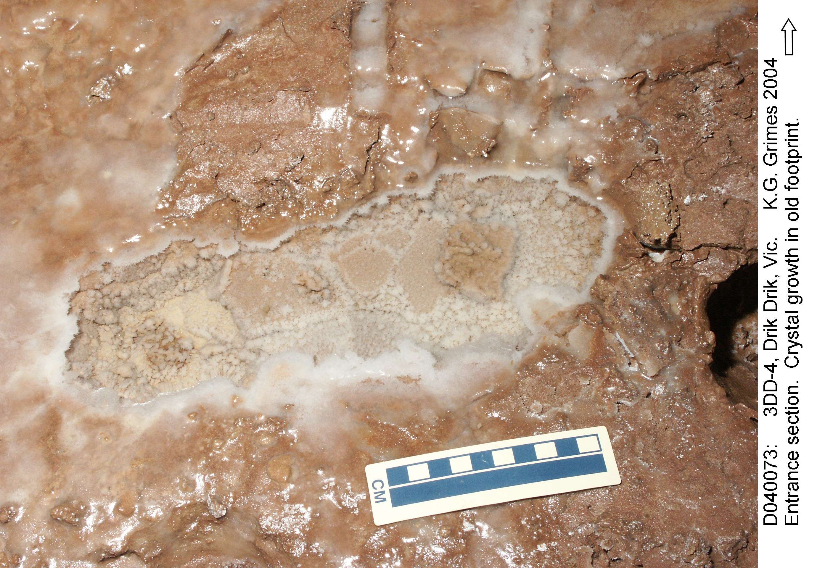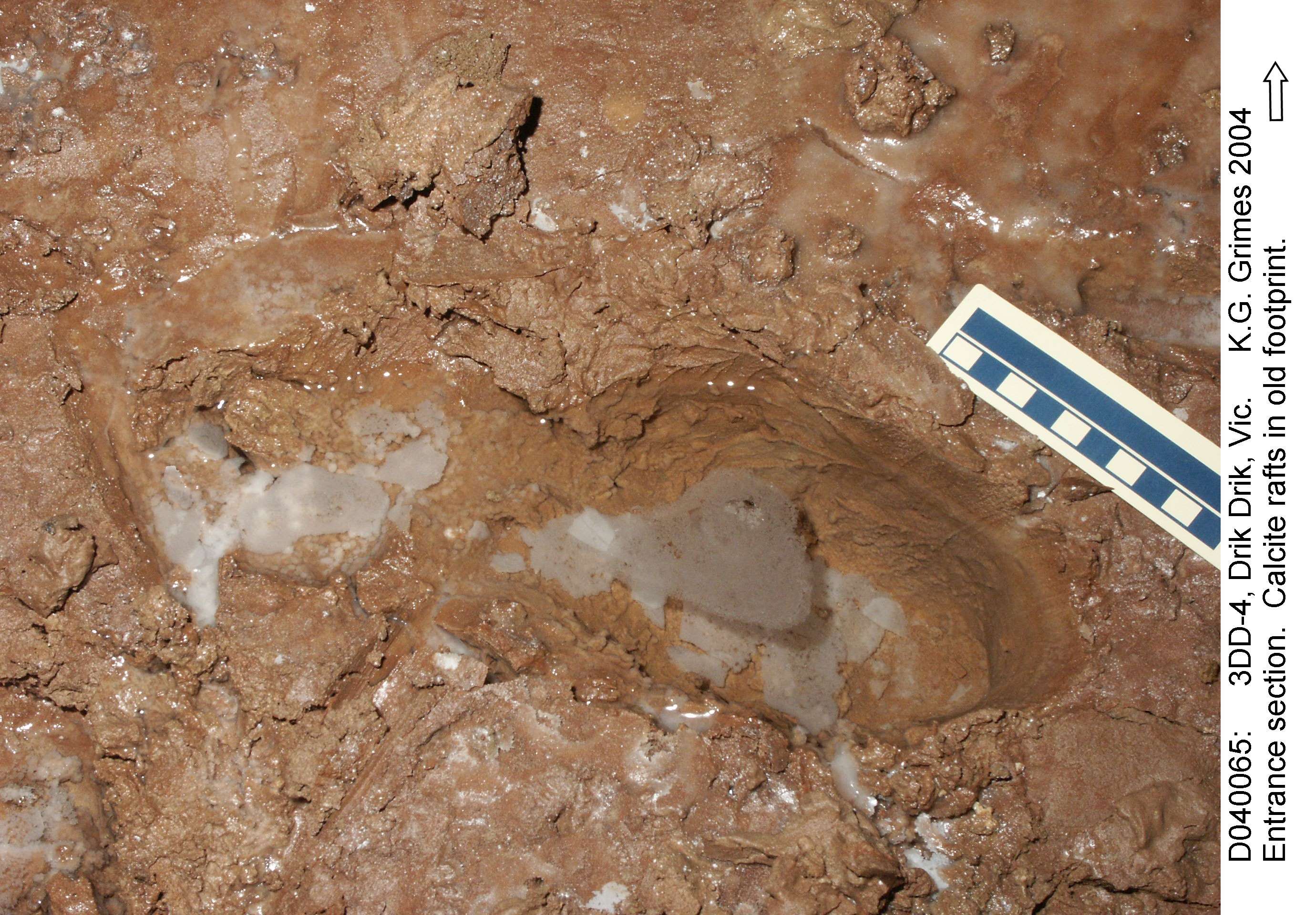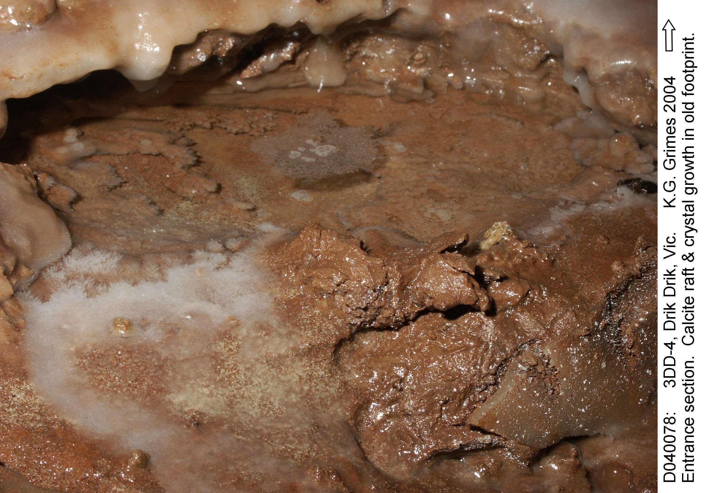 3DD-4: Entrance section. Old footprint - with calcite raft and crystal growths. File: D040067.jpg |