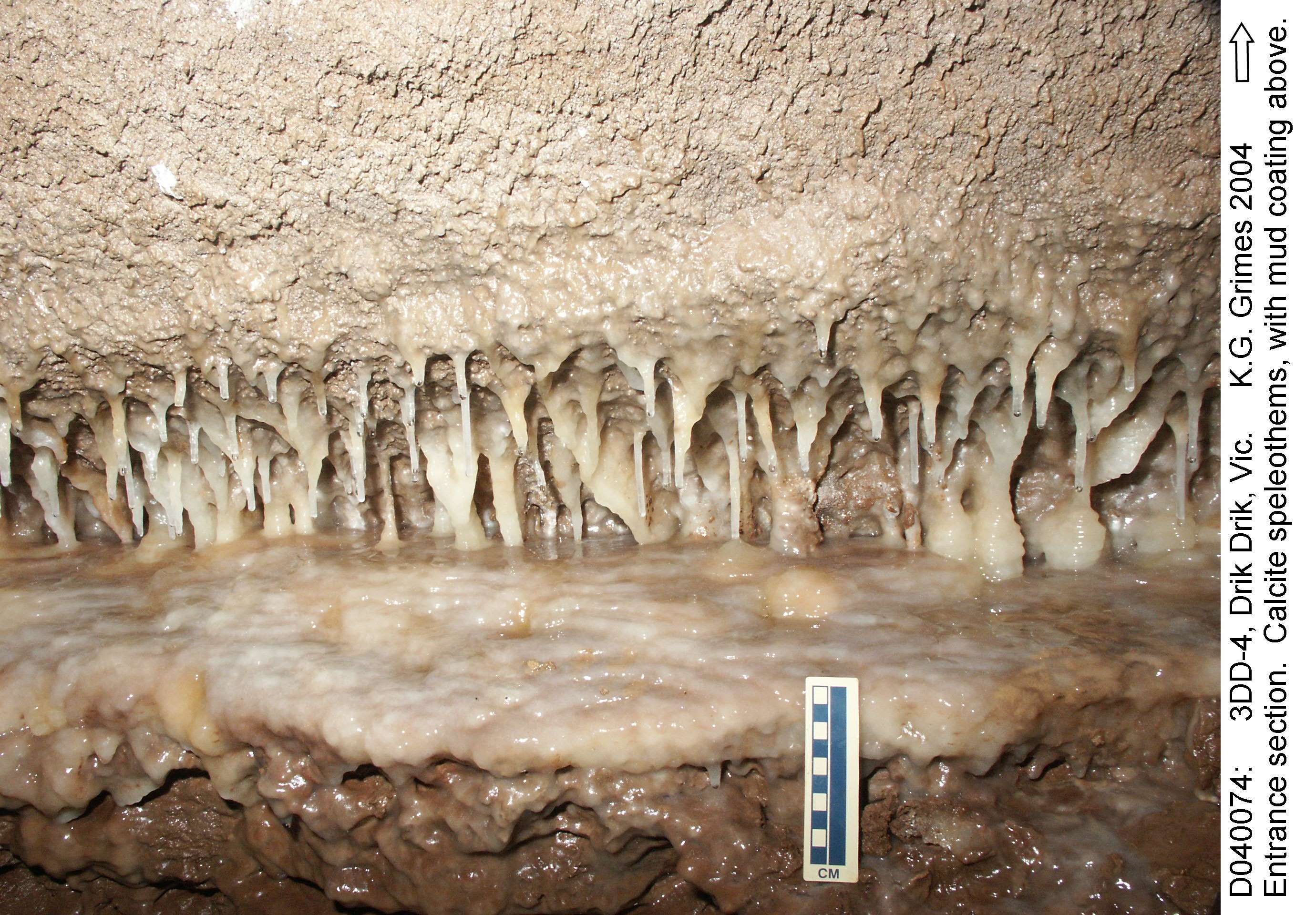 3DD-4: Entrance section. Row of speleothems on east wall. Coating mud deposits. File: D040074.jpg |