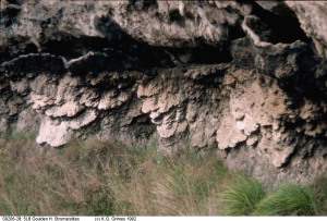 Stromatolites (calcareous algae growths) exposed on the walls of Goulden's Hole. These would have grown when the water table was higher in the past.