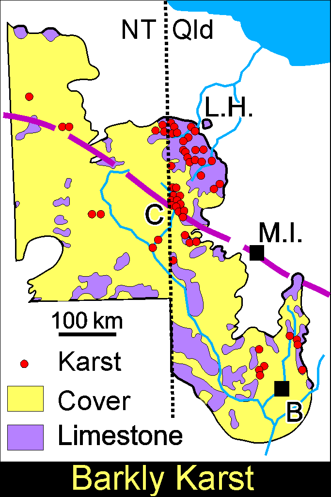 The karst is hosted by the carbonate rocks of the Cambro-Ordivician Georgina Basin. The Camooweal Dolomite occupies most of the centre of the basin while a number of limestone units occur around the margins. Karst development has been retarded by the arid climate, and also by the extensive cover of heavy black clay soils. These clays pond the rainfall (which occurs as intense storms separated by hot sunny periods) in surface hollows (Gilgae) so that infiltration into the carbonate rocks only occurs locally.
