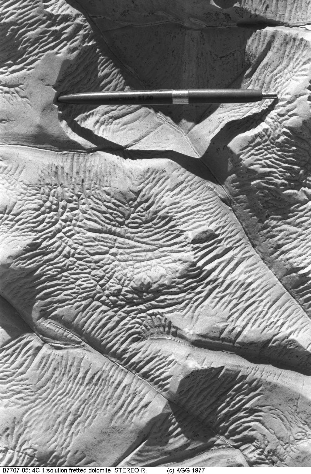 Stereopair of a dolomite outcrop (view cross-eyed) Fine etchings such as these are common. 15 cm Ball-point pen for scale. IMG00176.jpg