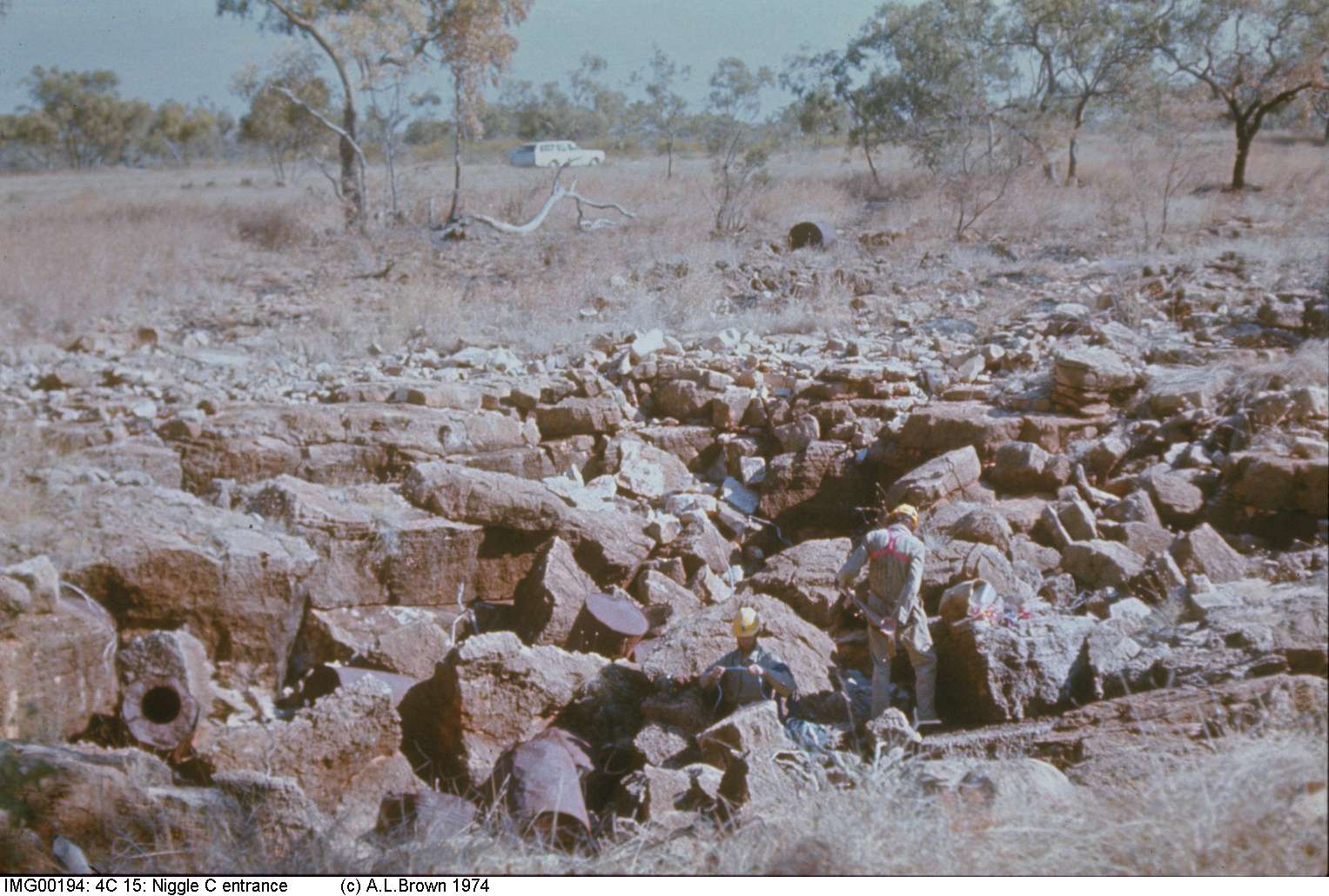 The Georgina River flows only during the wet season. Here, north of Camooweal, we see the dry channel and three collapse dolines. The one in the channel has been clogged with alluvial clay and now holds water. The two other dolines are connected by a cave and the right hand one takes flood waters from the river via a small overflow channel (see below). Local information is that it takes several days for the cave to fill up after the river starts flooding into it. IMG00196.jpg