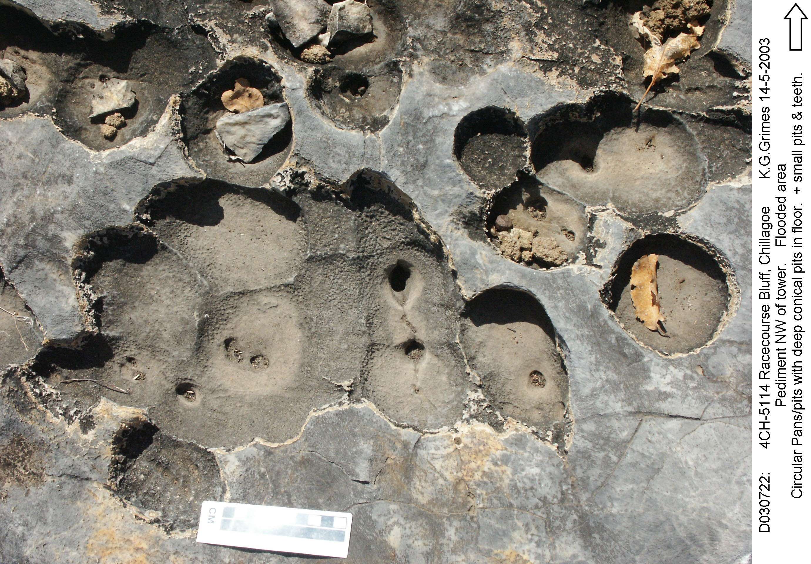 Pan with deep conical pits in floor. A pediment that is flooded regularly. Stereo-pair - view cross-eyed. File: D030720.jpg and ..719 |