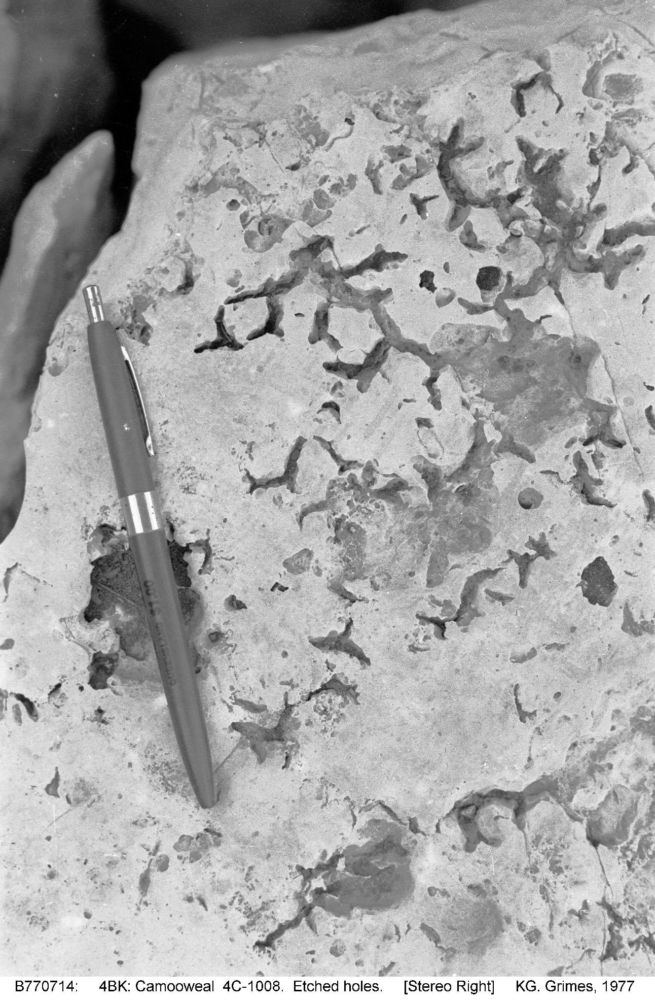 Two levels of etched joints: Large joints form deep v-notches, and there is a finer mesh of small etched cracks. Stereo-pair: view cross-eyed. File: B770705s.tif |