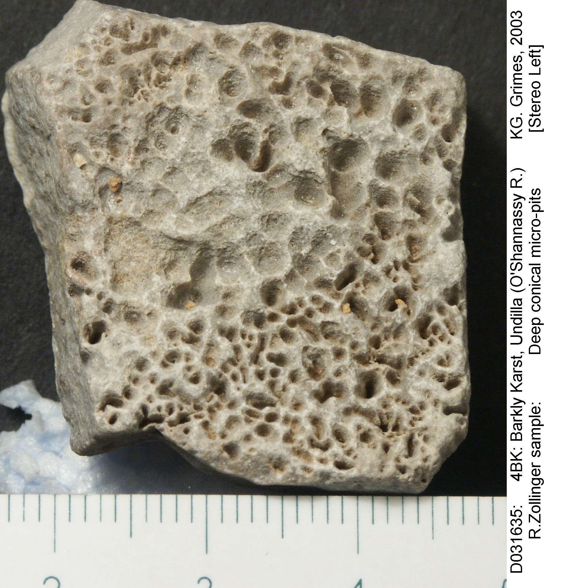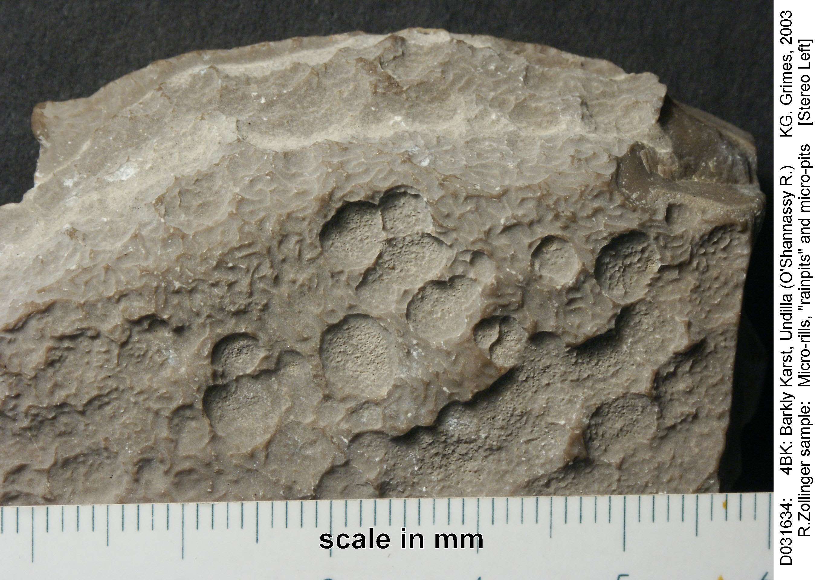 Moving south the larger karren forms become weaker and we find mainly grikes and etched bedding planes, with "rainpits" replacing the rillenkarren. Microkarren have been recently reported by the 2003 cave expedition to the O'Shannassy River (north of Undilla). These are illustrated in the photos below and include microrills, networks and rasp-like teeth, as well as fine pitting.