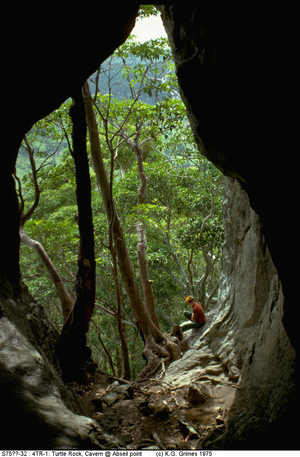 A set of pseudokarst(?) caves occur in the upper part of a mesa of flat-lying rhyolitic ignimbrite near the Lamington National Park, south-east Queensland.