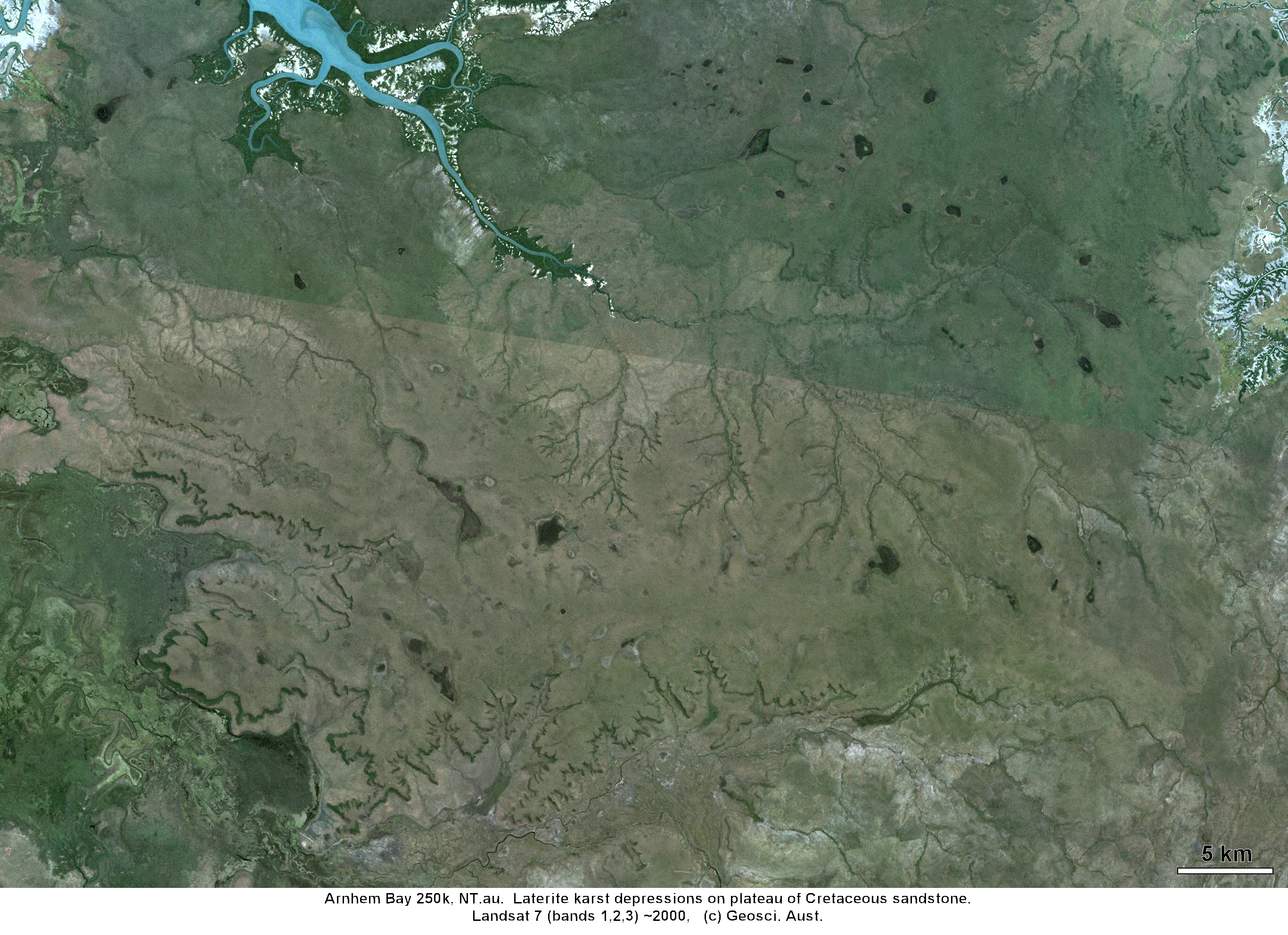 Landsat image of pans on the undissected parts of a low-lying laterite plateau. Arnhem Bay region, Northern Territory.