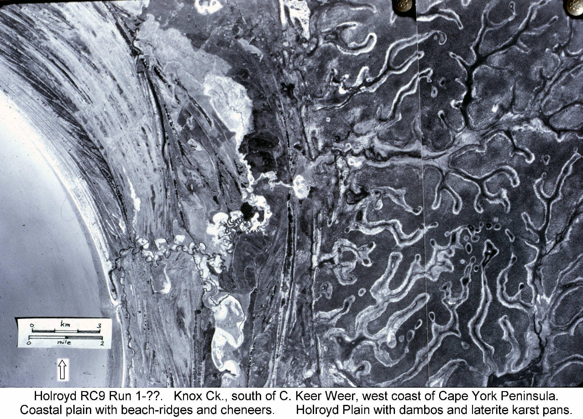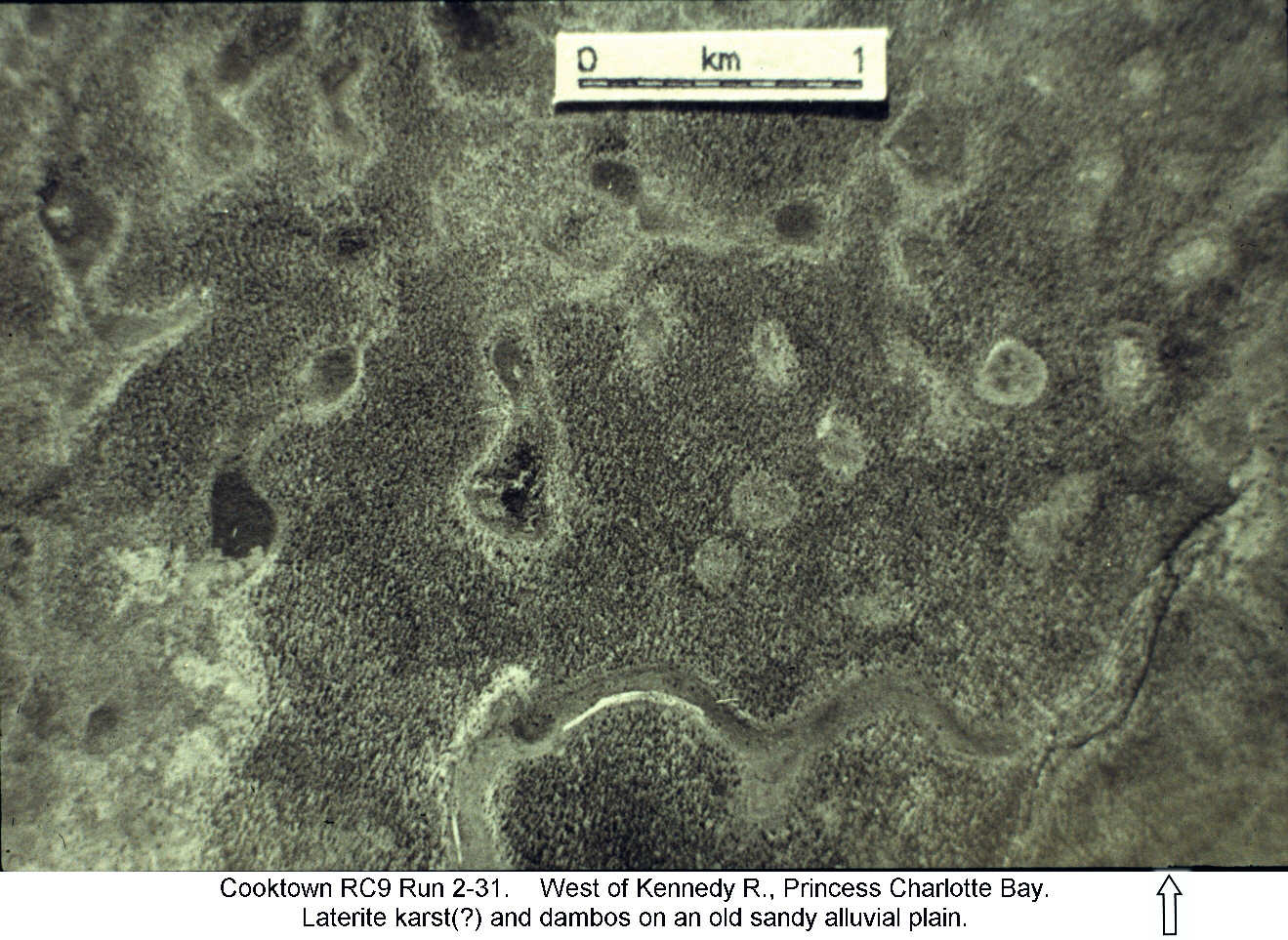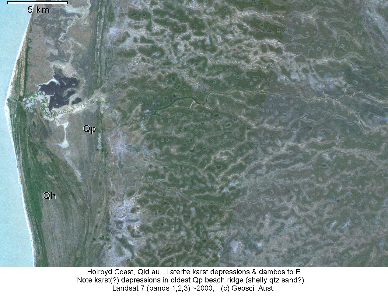 Landsat image of the west coast of Cape York Peninsula, Queensland. On the eastern side, dambos and pans occur on a low-lying lateritic surface. Along the coast are Quaternary beachridges (Qp & Qh). The inner, last interglacial (Qp), ridges also have pans, but in that case the formation is probably solution of shelly material in the beach sands, rather than silicate karst.