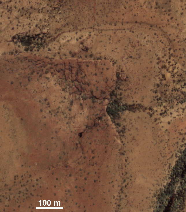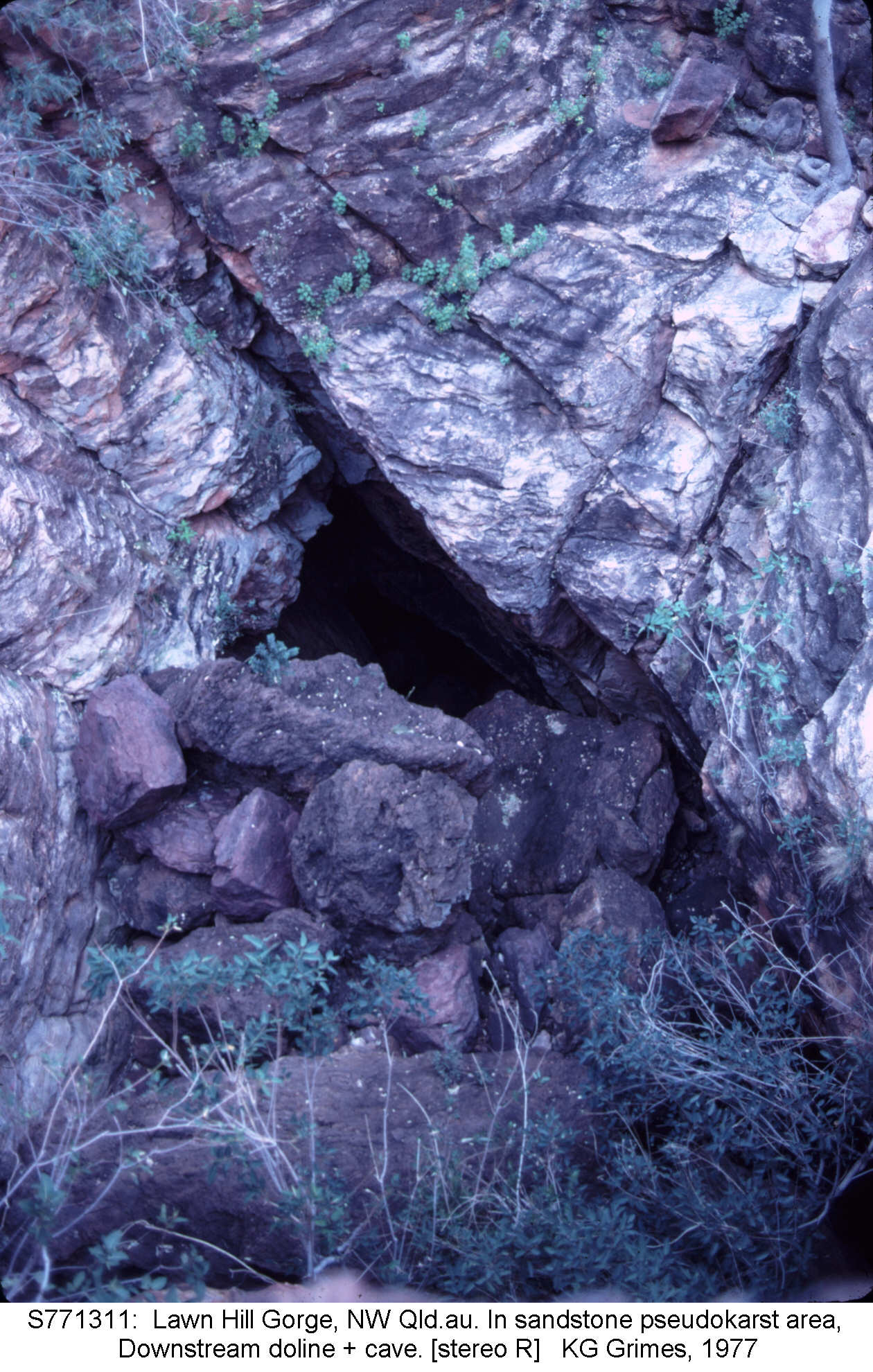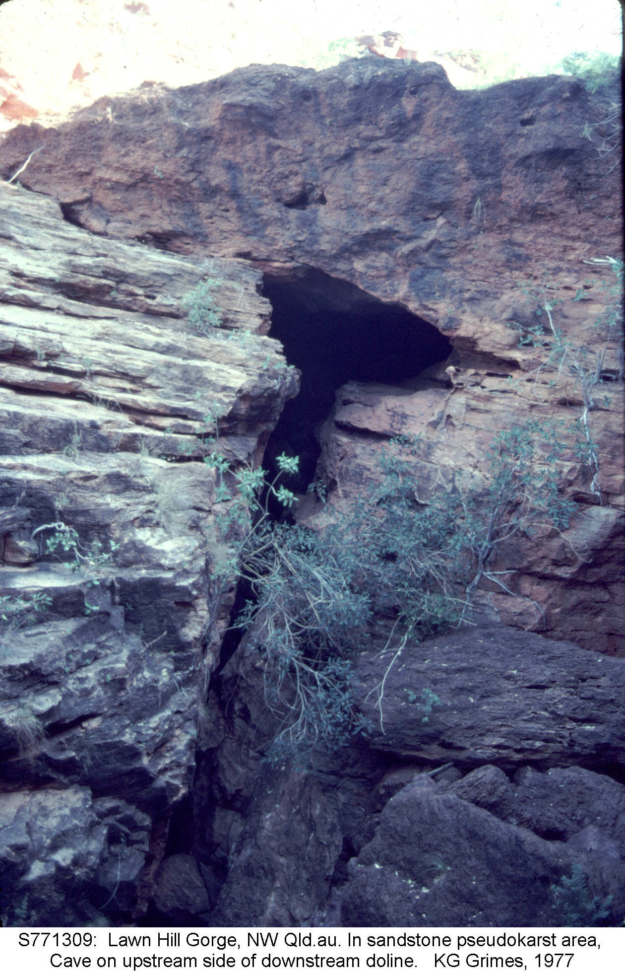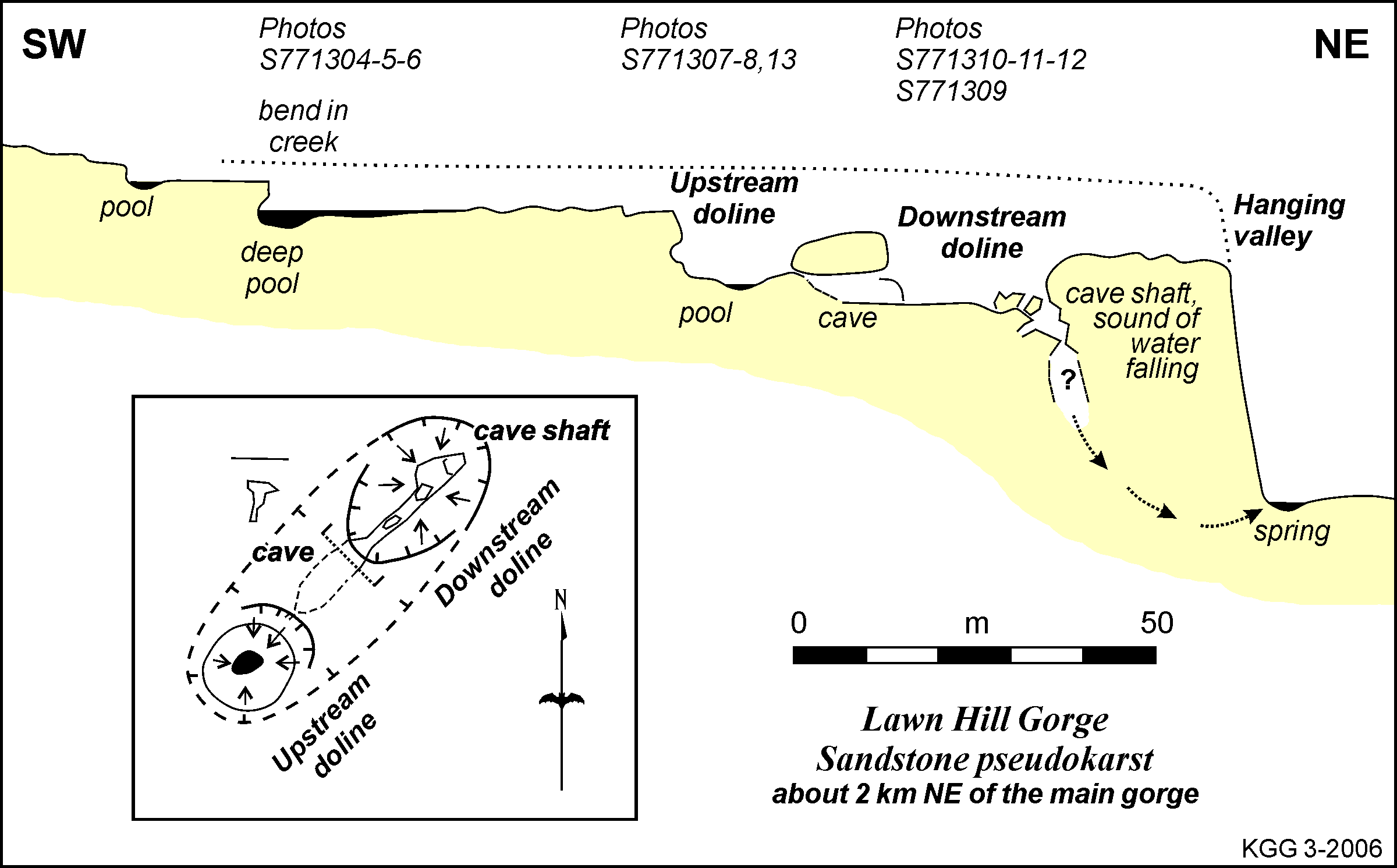 The main karst interest at Lawn Hill gorge is the Colless grikefield in the Cambrian dolomites upstream from the main sandstone gorge [link]. However there is also an area of sandstone pseudokarst or parakarst to the northeast of the main gorge. This is opposite the gap where Widallion creek cuts through the Constance Range. At the edge of the main plateau there is a spring at the base of the scarp that lies directly beneath a hanging valley.