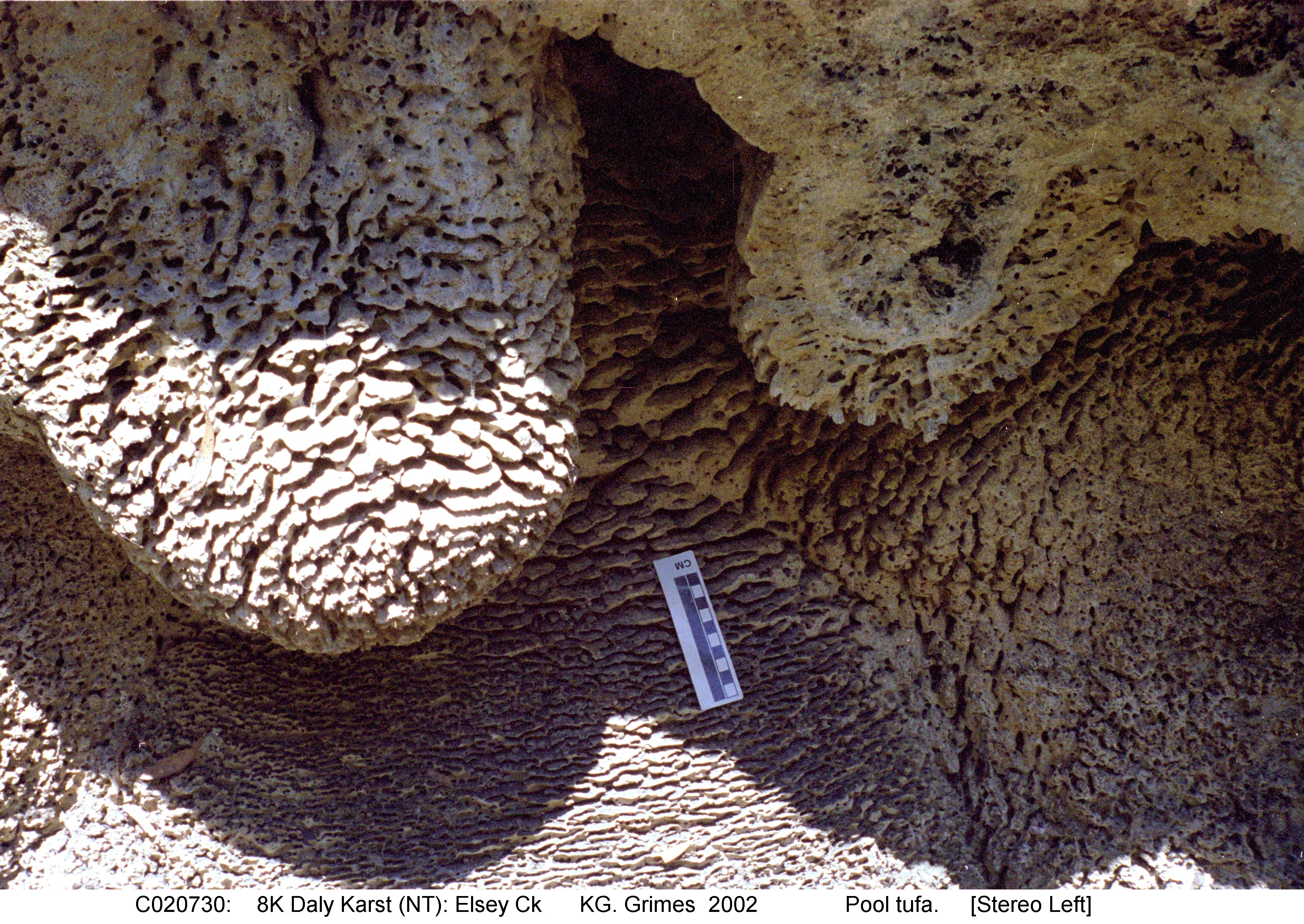 Elsie Ck., Daly Karst Region, Northern Territory. Closer view of the lobate tufa wall. (10 cm scale bar) Stereo-pair, view cross-eyed. File: C020805.jpg |