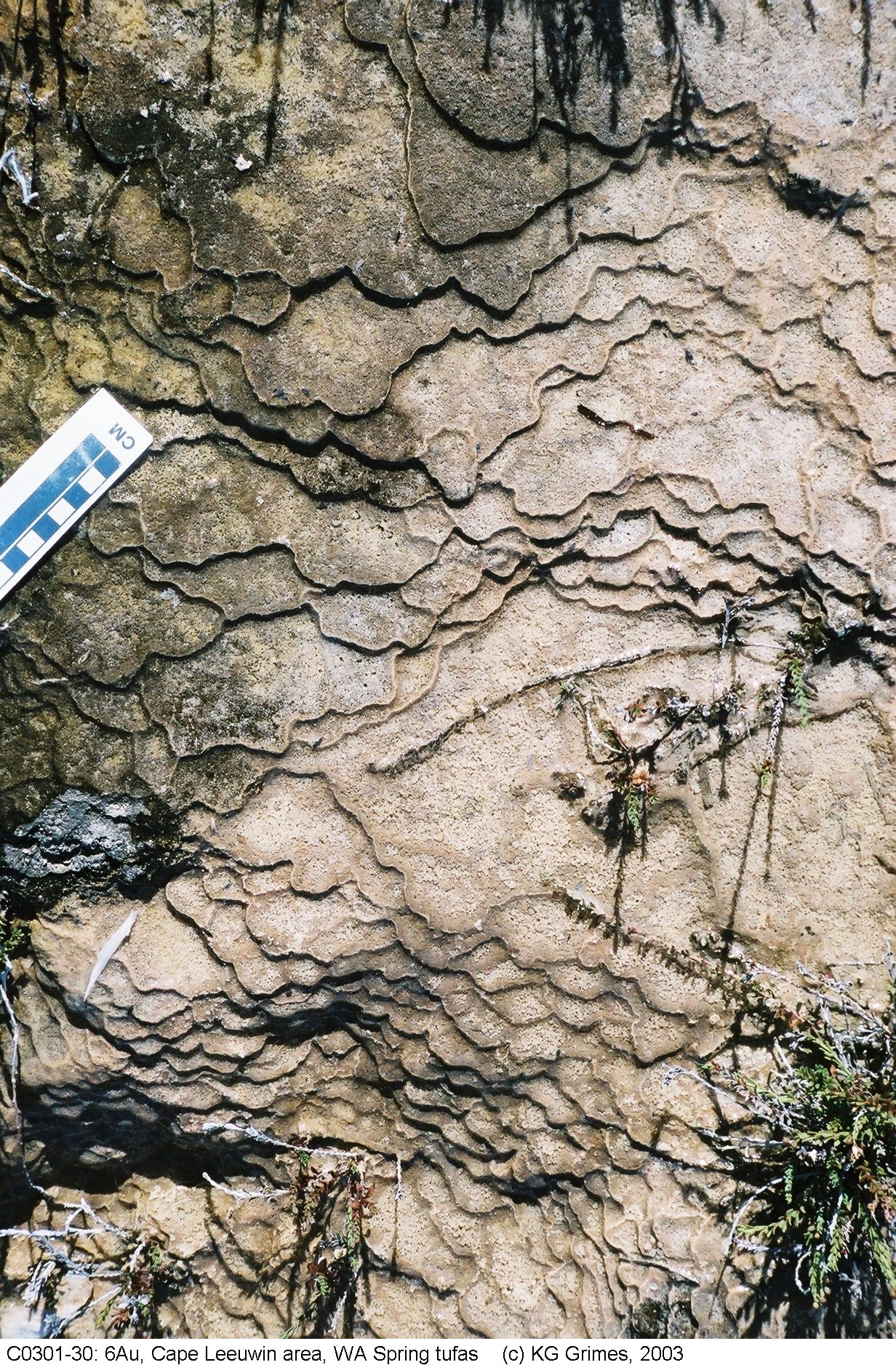 The Springs, Cape Bridgewater, Victoria. Quaternary dune limestone (light brown) overlies basalt (black). Springs at the horizontal contact have formed tufa mounds and pools. File: C981224.jpg |