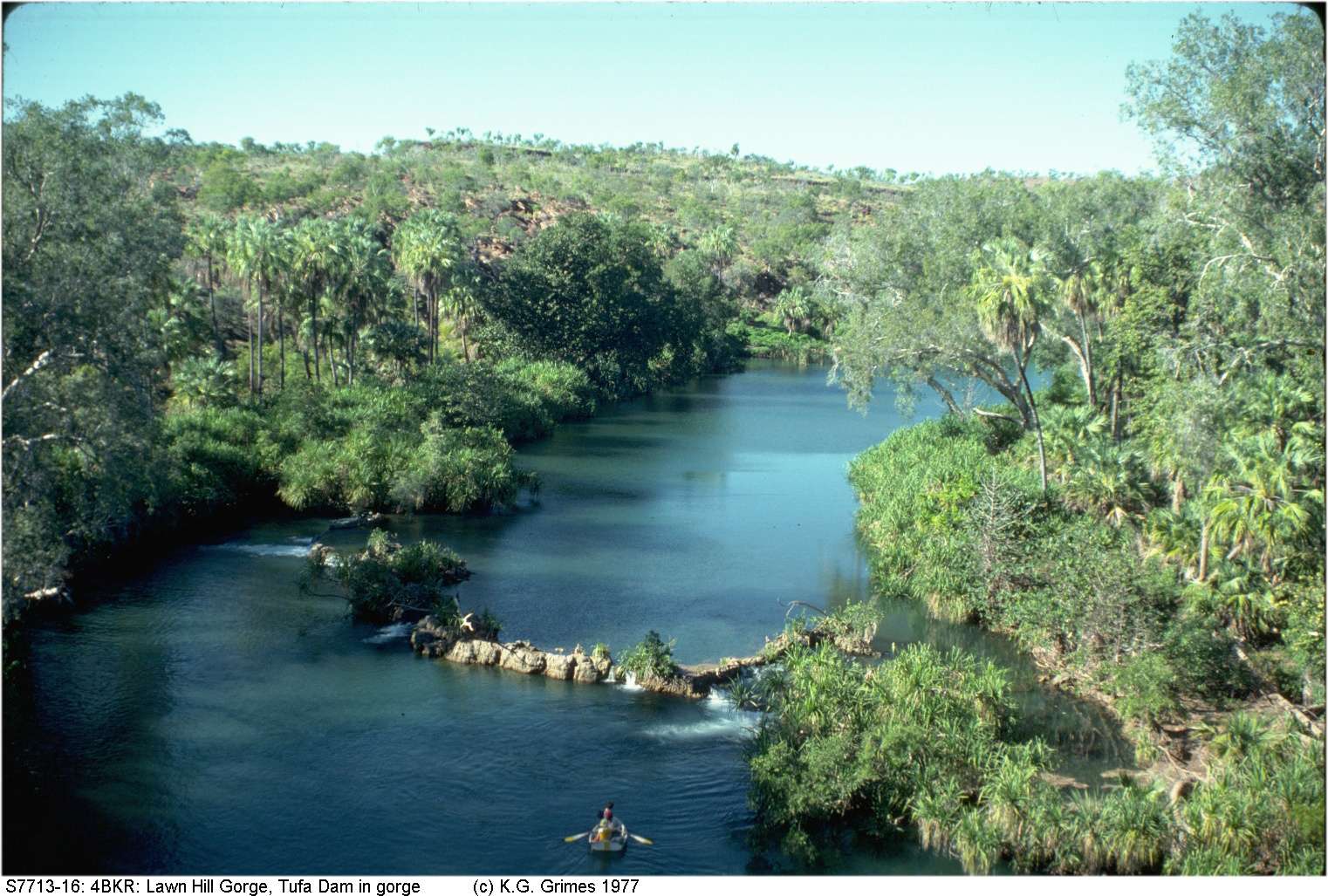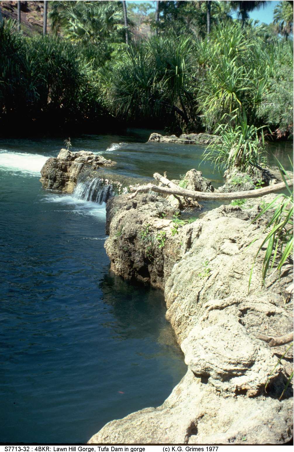 Two views of a major tufa dam built across the sandstone part of Lawn Hill Gorge.