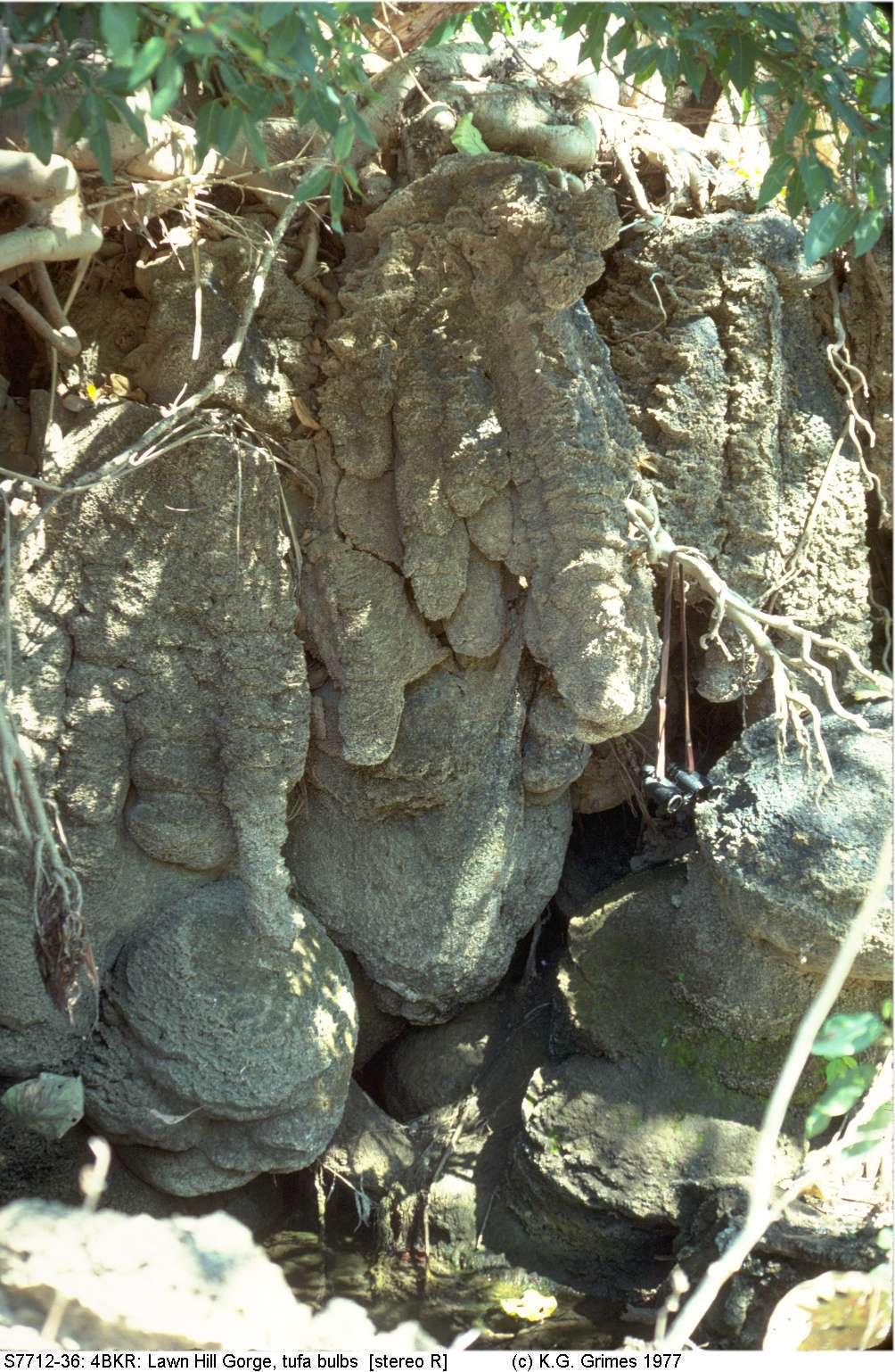 The main part of the gorge (right) is in older, steeply dipping, sandstone but contains tufa dams.