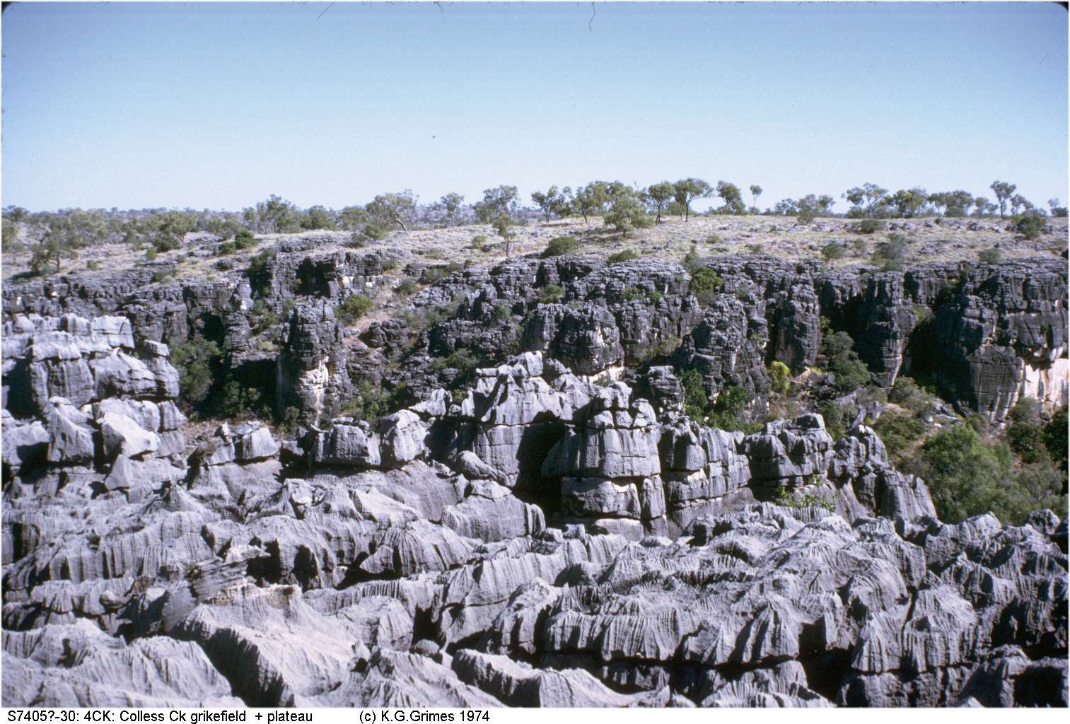 This is the dissected margin of the taleland that forms most of the Barkly Karst Region. The area has incised gorges, extensive grike fields on the plateau remnants, and springs with spring tufa deposits. There are also caves, but these are not yet well explored.