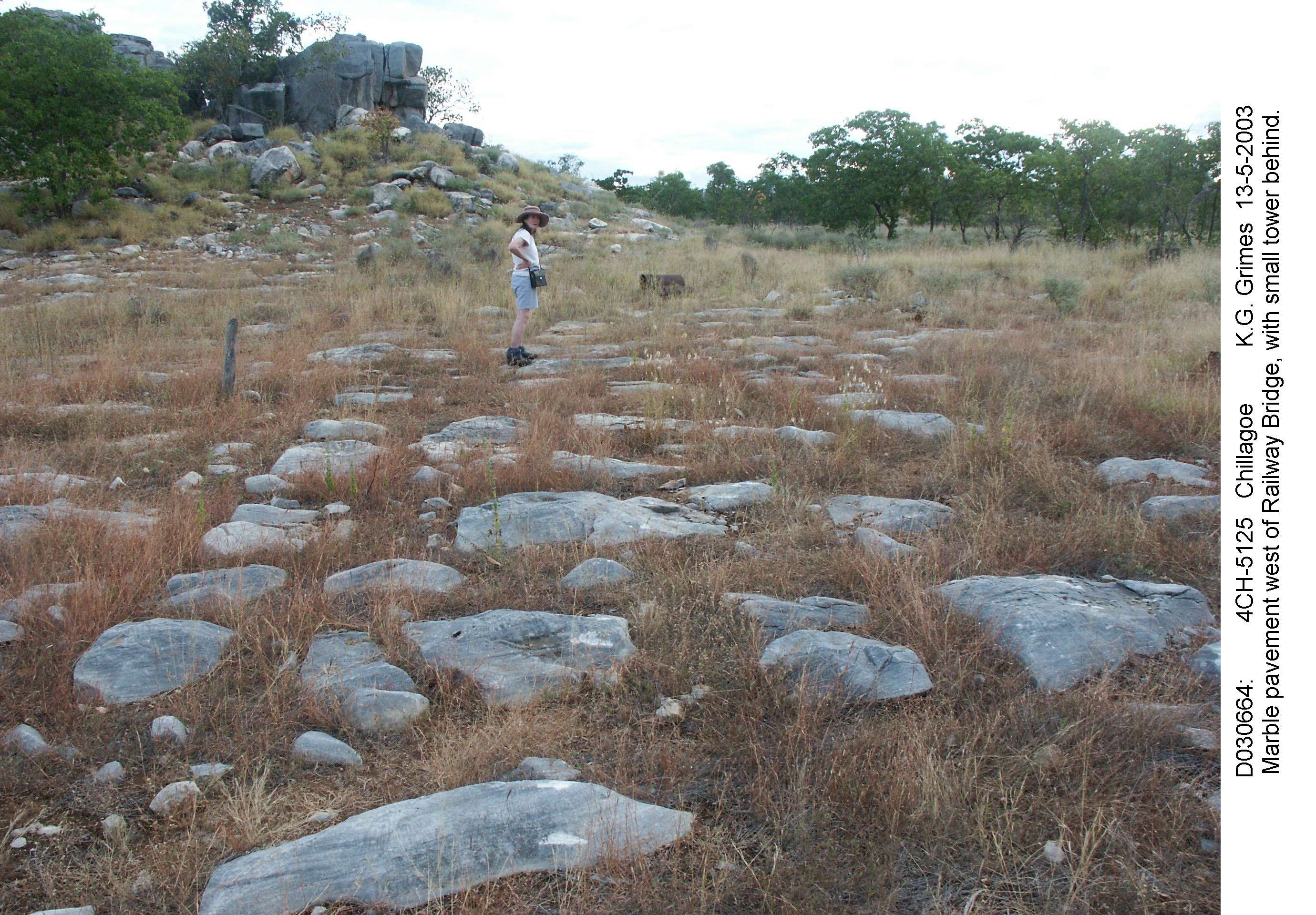 Limestone pediment, with a small tower behind it. Clints and soil-filled grikes. File: D030664.jpg |