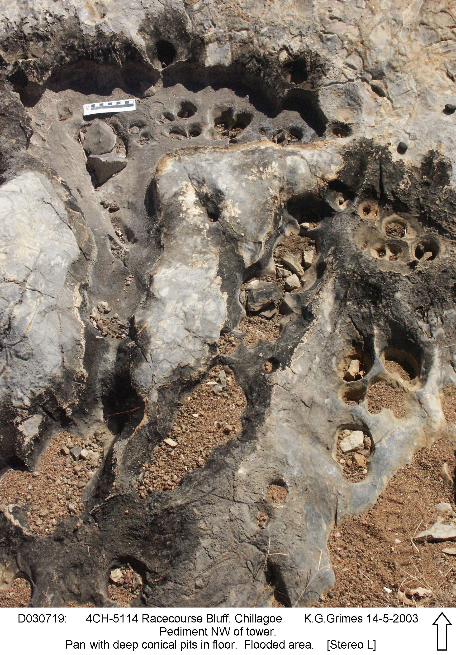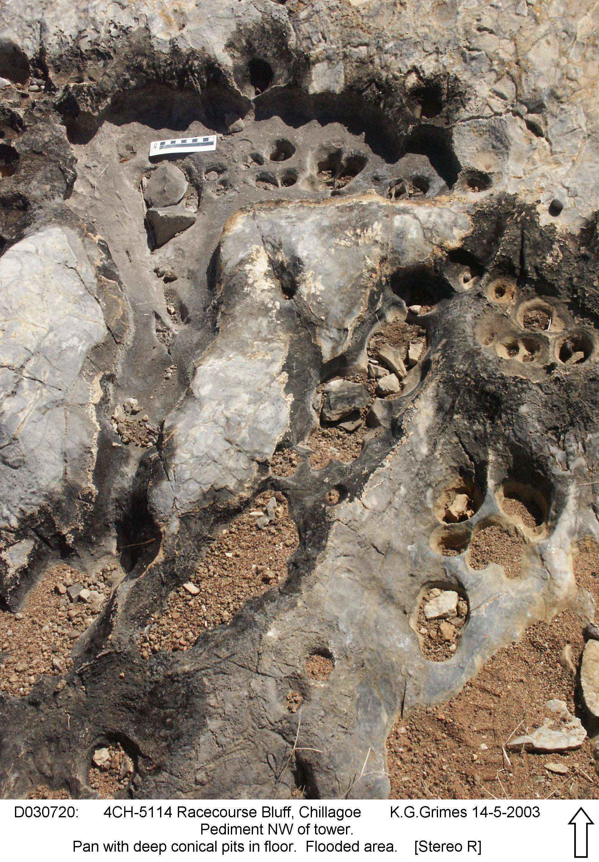 Pan with deep conical pits in floor. A pediment that is flooded regularly. Stereo-pair - view cross-eyed. File: D030720.jpg and ..719 |
