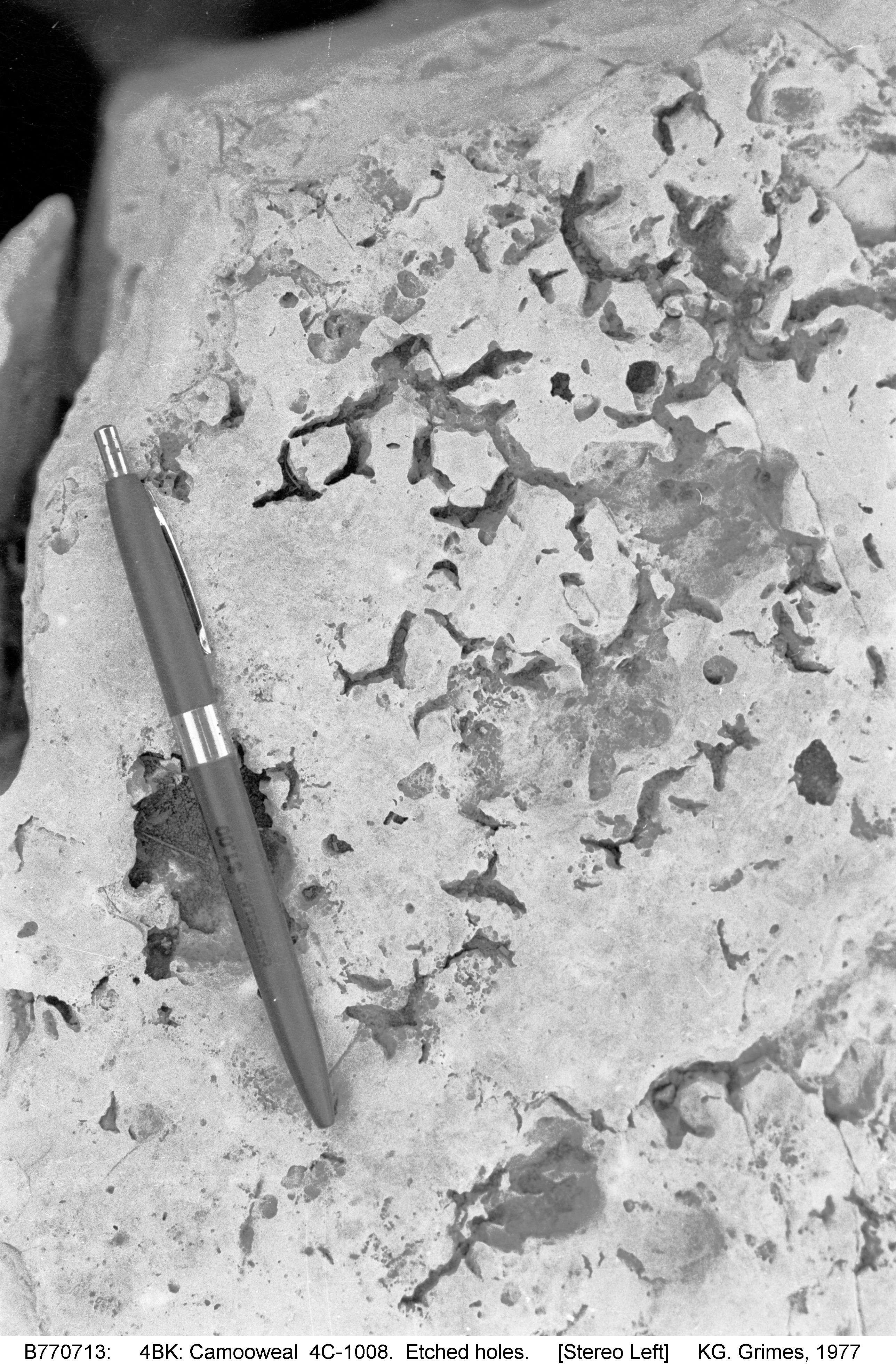 Fine pitting on the underside of a cobble. These were in contact with the soil. The upper surface had fine micro-rills (see page on microkarren). On limestone near Boulia. File: D031631.jpg |