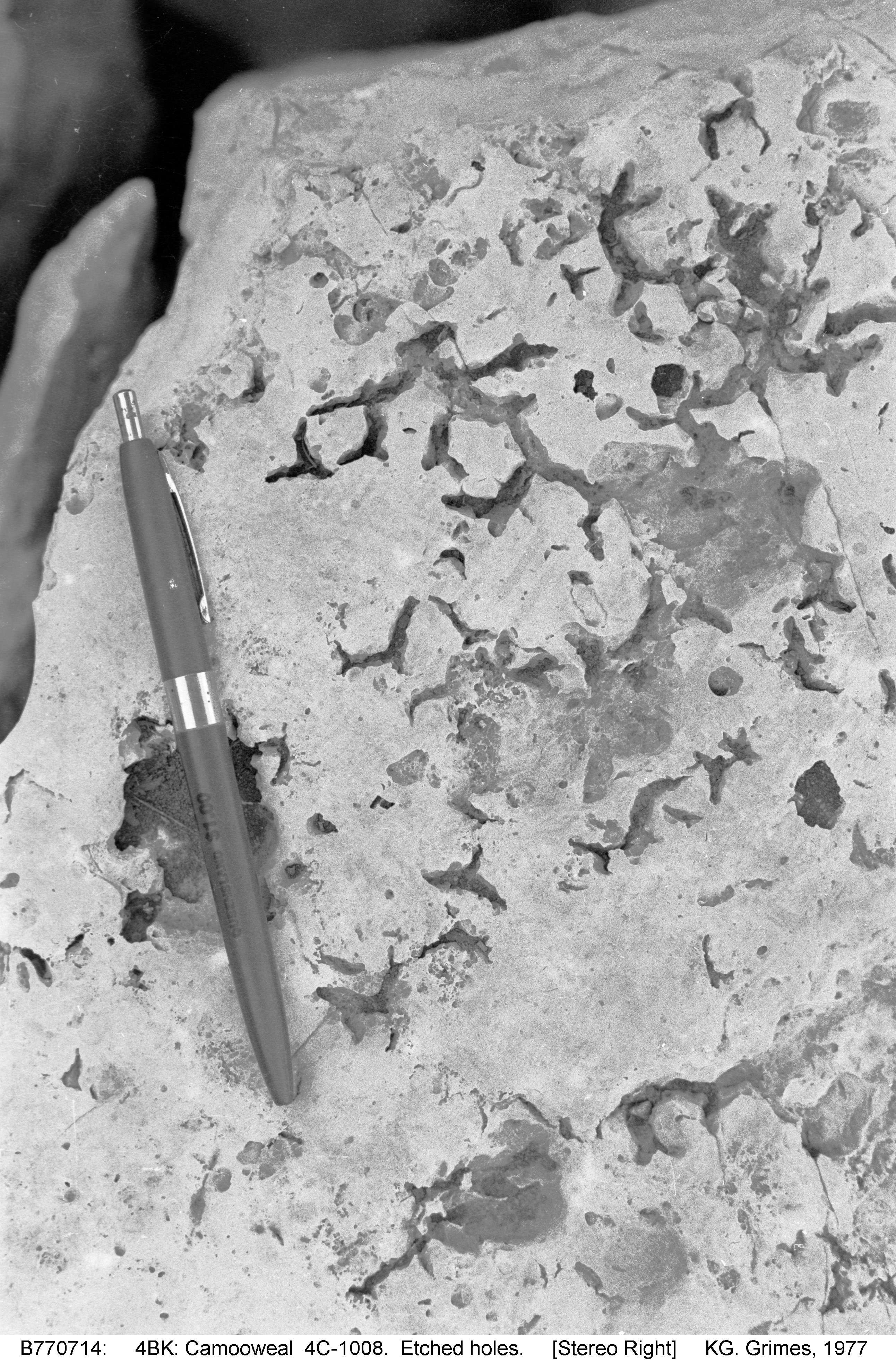 Two levels of etched joints: Large joints form deep v-notches, and there is a finer mesh of small etched cracks. Stereo-pair: view cross-eyed. File: B770705s.tif |