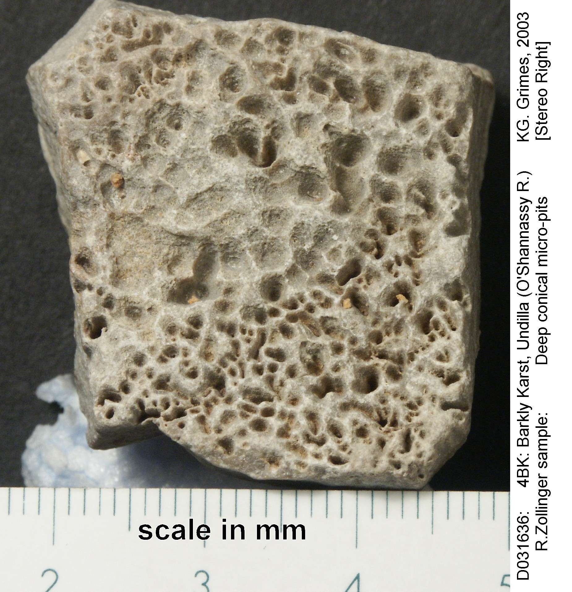 Moving south the larger karren forms become weaker and we find mainly grikes and etched bedding planes, with "rainpits" replacing the rillenkarren. Microkarren have been recently reported by the 2003 cave expedition to the O'Shannassy River (north of Undilla). These are illustrated in the photos below and include microrills, networks and rasp-like teeth, as well as fine pitting.