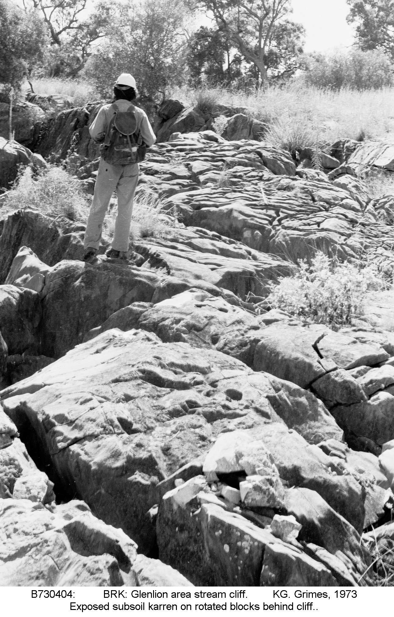Glenlyon streamcliff. Subsoil karren exposed on rotated blocks behind the cliff. File: B730404.jpg |