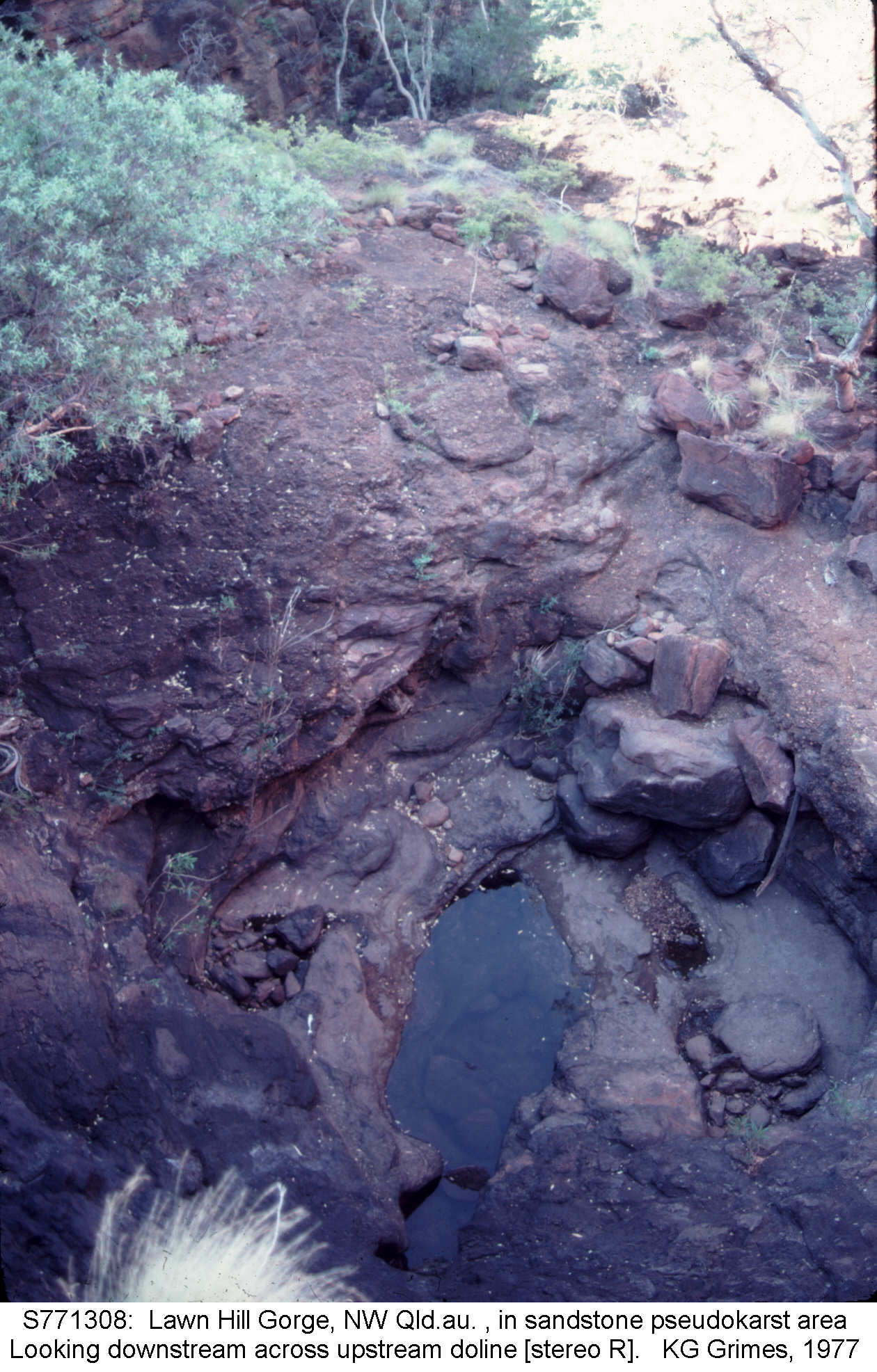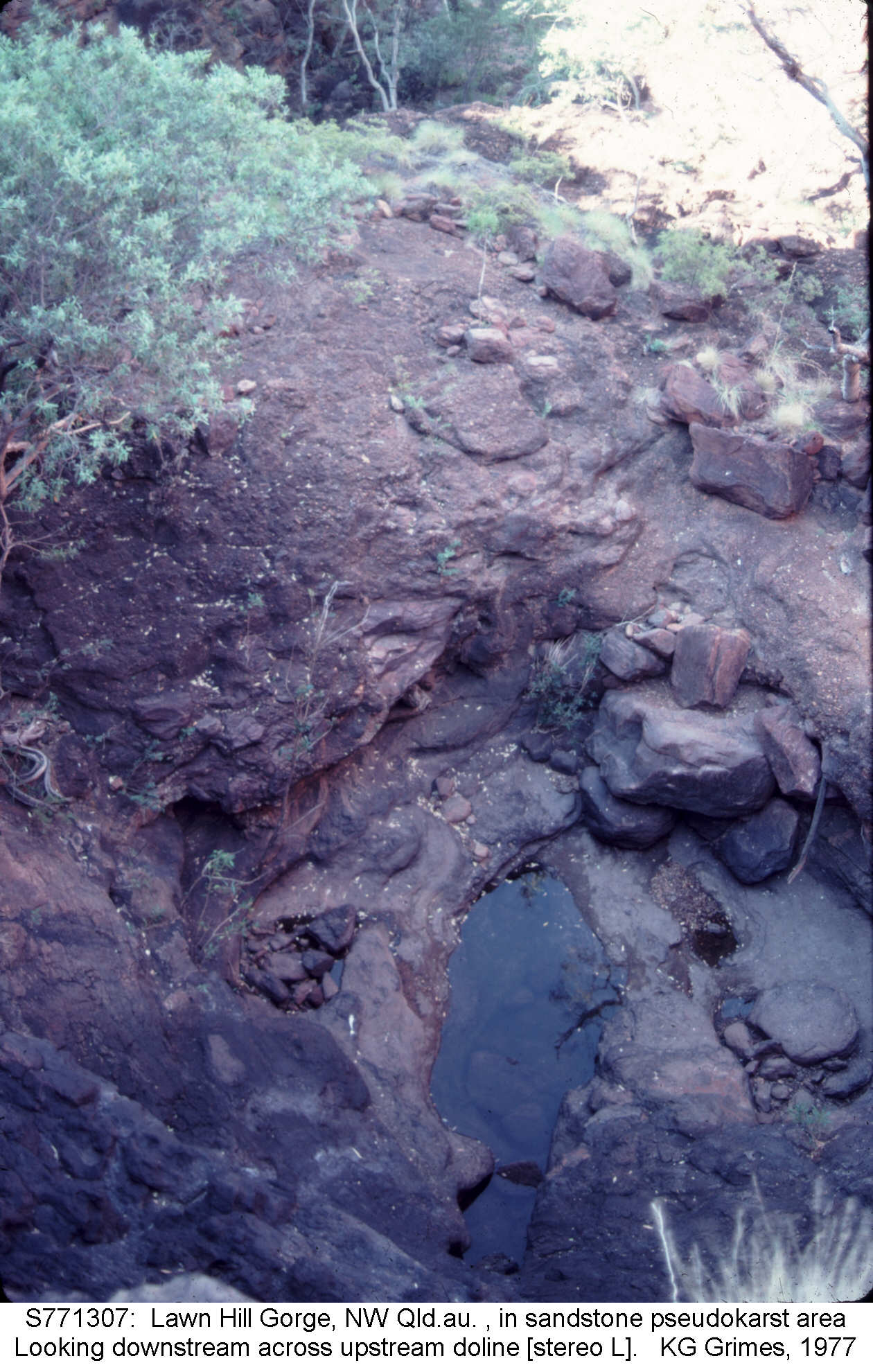 The main karst interest at Lawn Hill gorge is the Colless grikefield in the Cambrian dolomites upstream from the main sandstone gorge [link]. However there is also an area of sandstone pseudokarst or parakarst to the northeast of the main gorge. This is opposite the gap where Widallion creek cuts through the Constance Range. At the edge of the main plateau there is a spring at the base of the scarp that lies directly beneath a hanging valley.