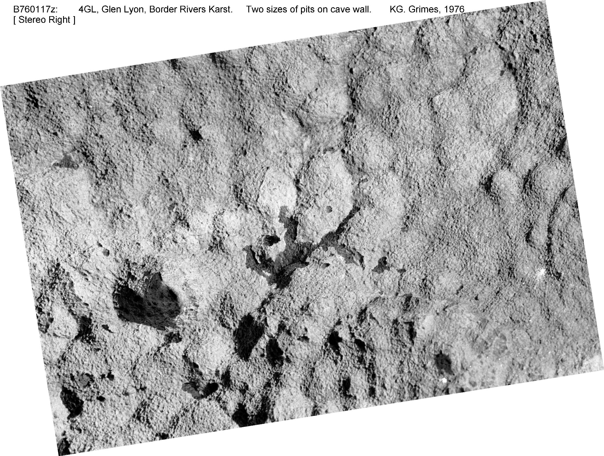 Two sizes of pits on a cave wall. The larger pits (about 1-2cm) have much finer pits superimposed on them. Stereopair: view cross-eyed. File: B760117z.jpg |