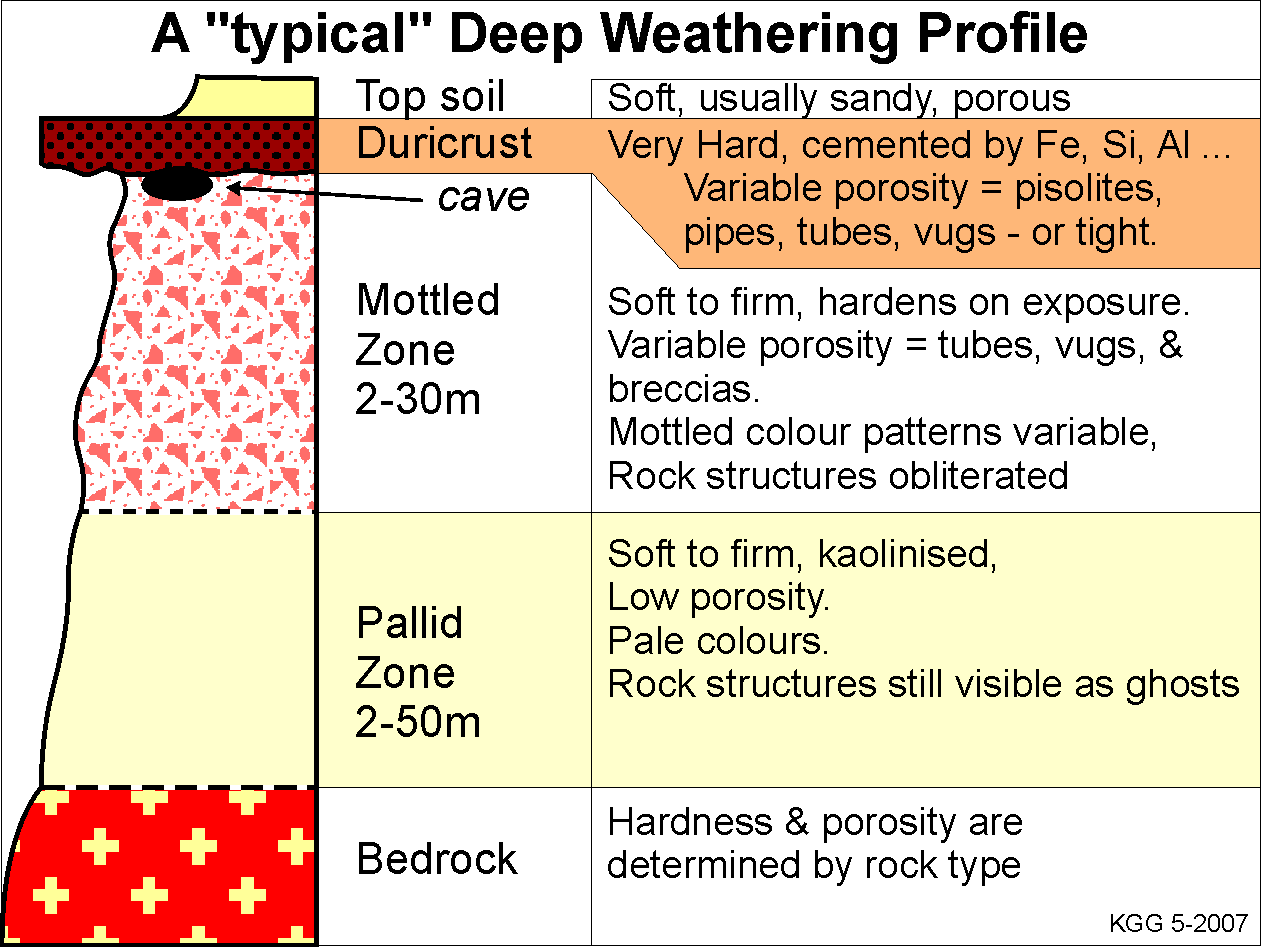 The diagram shows a "typical" DWP. But there is a lot of variation between and within profiles. Secondary (karstic) porosity is most common in the mottled zone and within the duricrust, but again there is much variation - some duricrusts are quite impermeable and perched watertables occur above them.