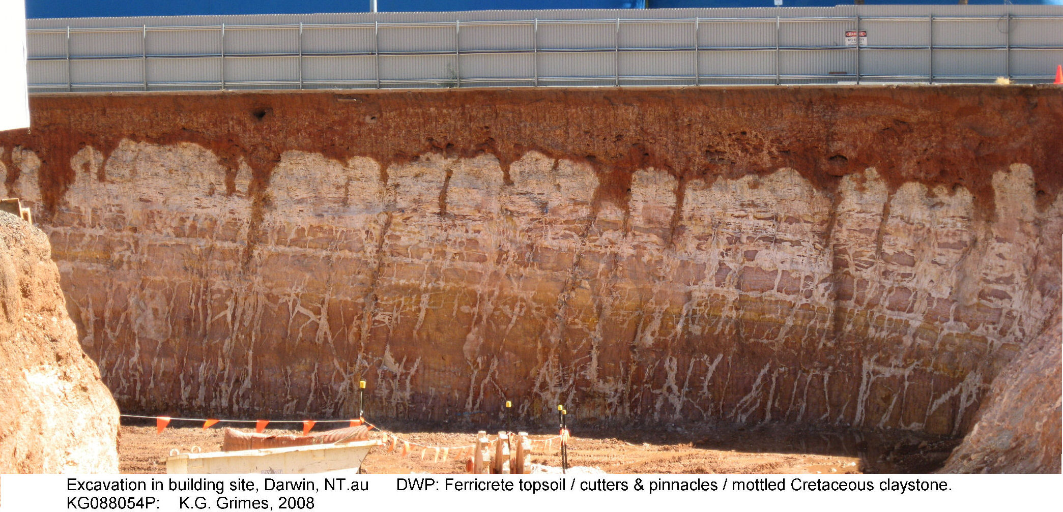 It has a (younger?) ferruginous soil overlying an "epikarst" surface of cutters and pinnacles above a mottled zone developed on a gently dipping Cretaceous claystone. The mottles are elongated along joints or small solution tubelets.