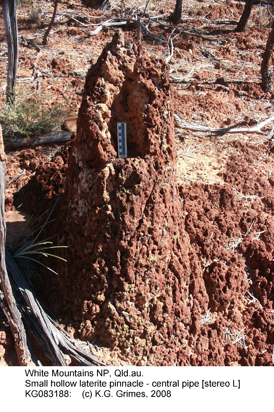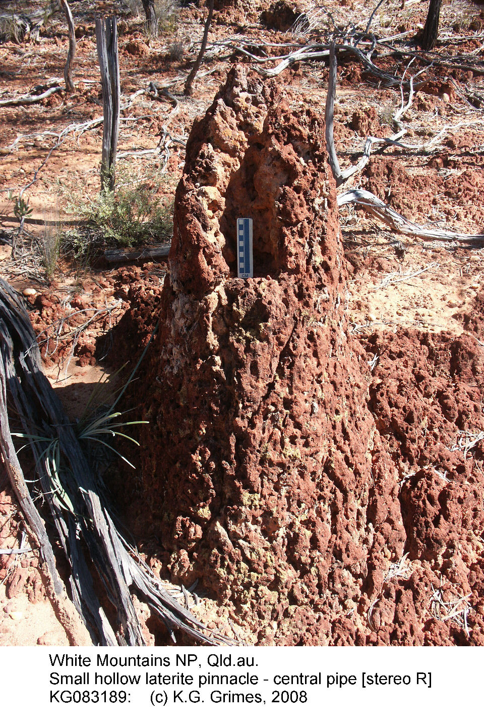 Sterepair of a laterite pinnacle with a hollow core Dissected edge of the Denna Plain, Hughenden, Queensland Stereopair - view cross-eyed. KG083189s.JPG and KG083188s.JPG |
