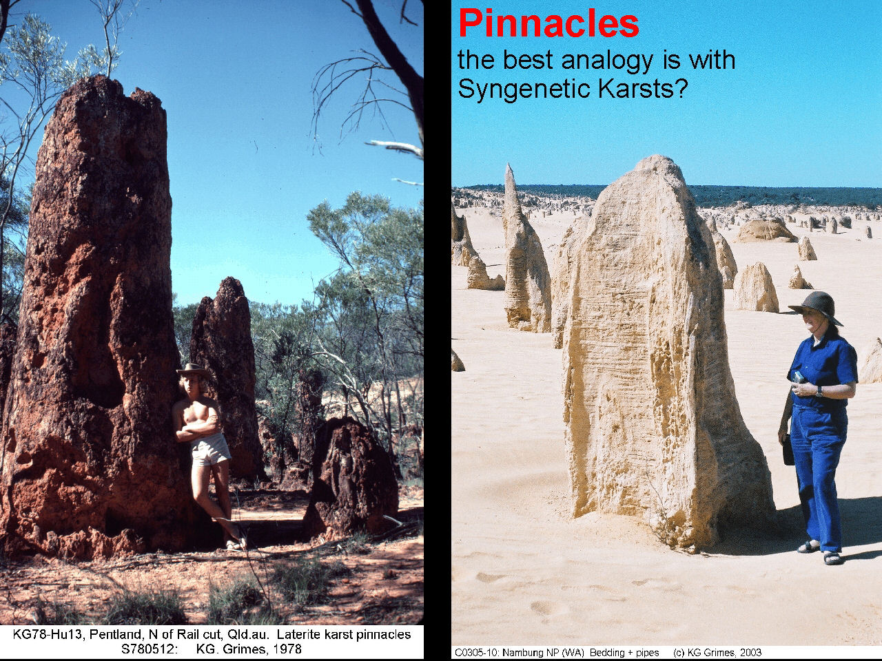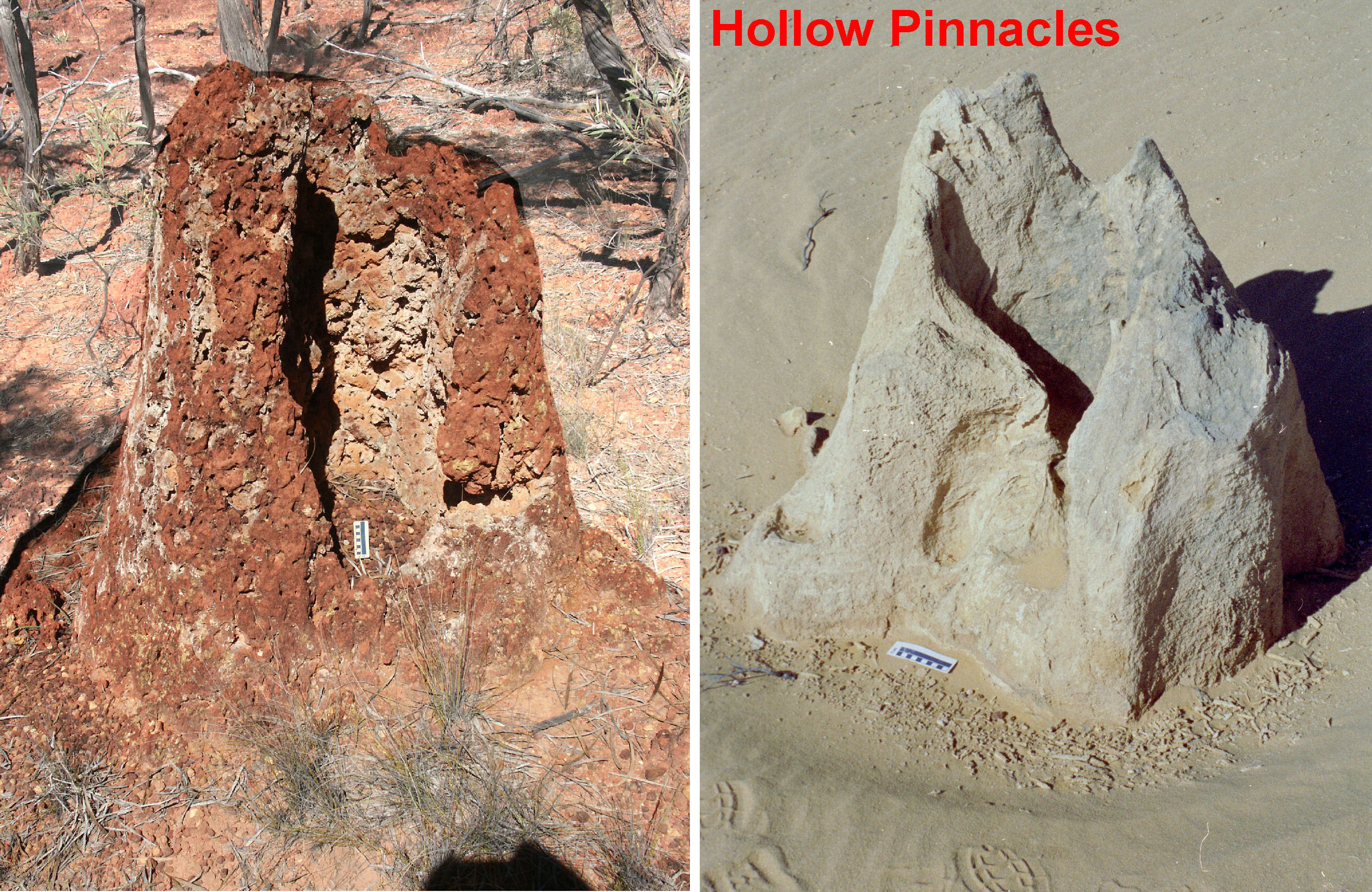 Left: Pinnacles in a laterite profile, Denna Plain, Queensland Right: Similar Pinnacles in dune limestone at Nambung, WA Both forms appear to form by cementation by focussed vertical water flow through the sediment. They have been left upstanding after erosion of the softer surrounding material. PandP1.jpg |