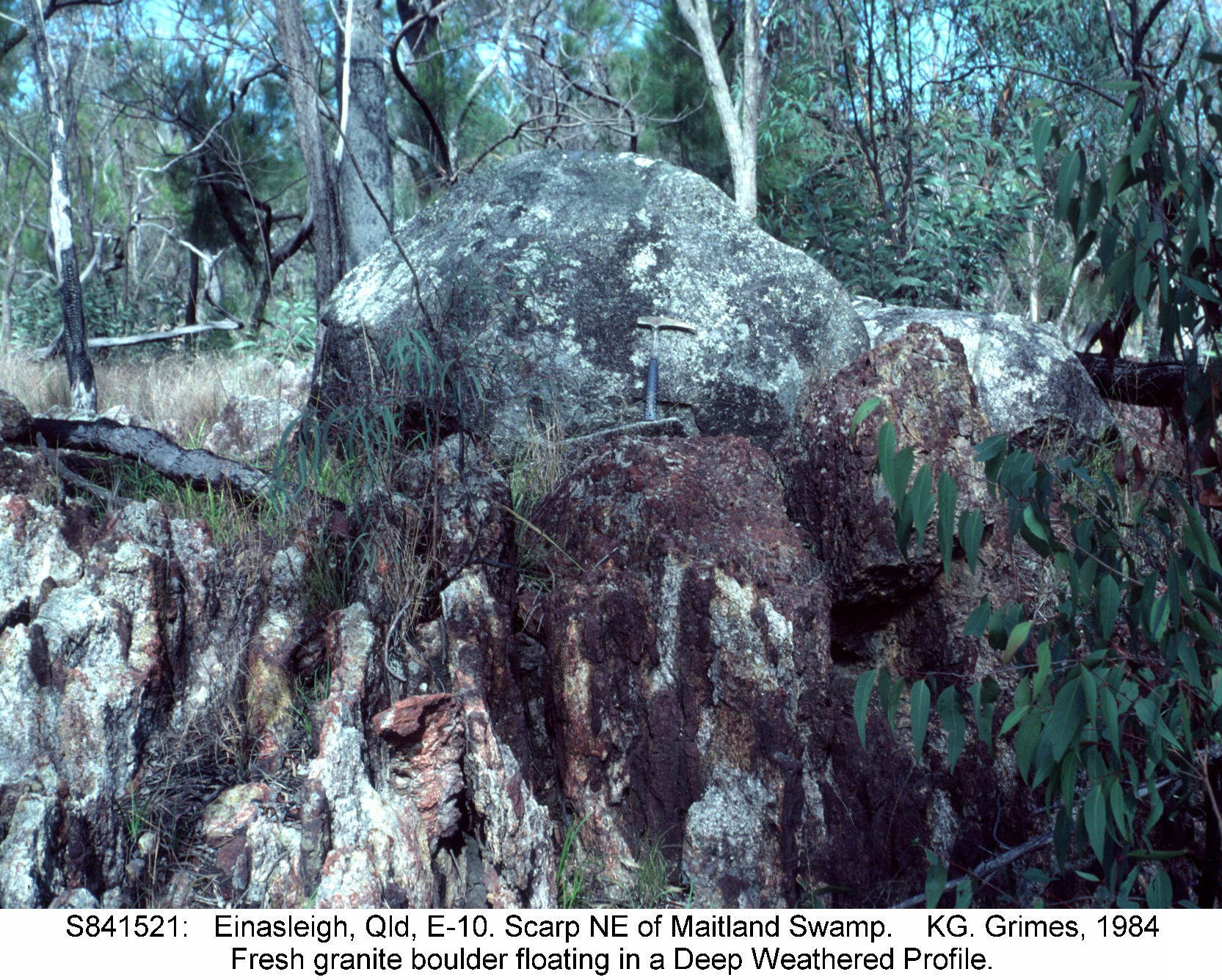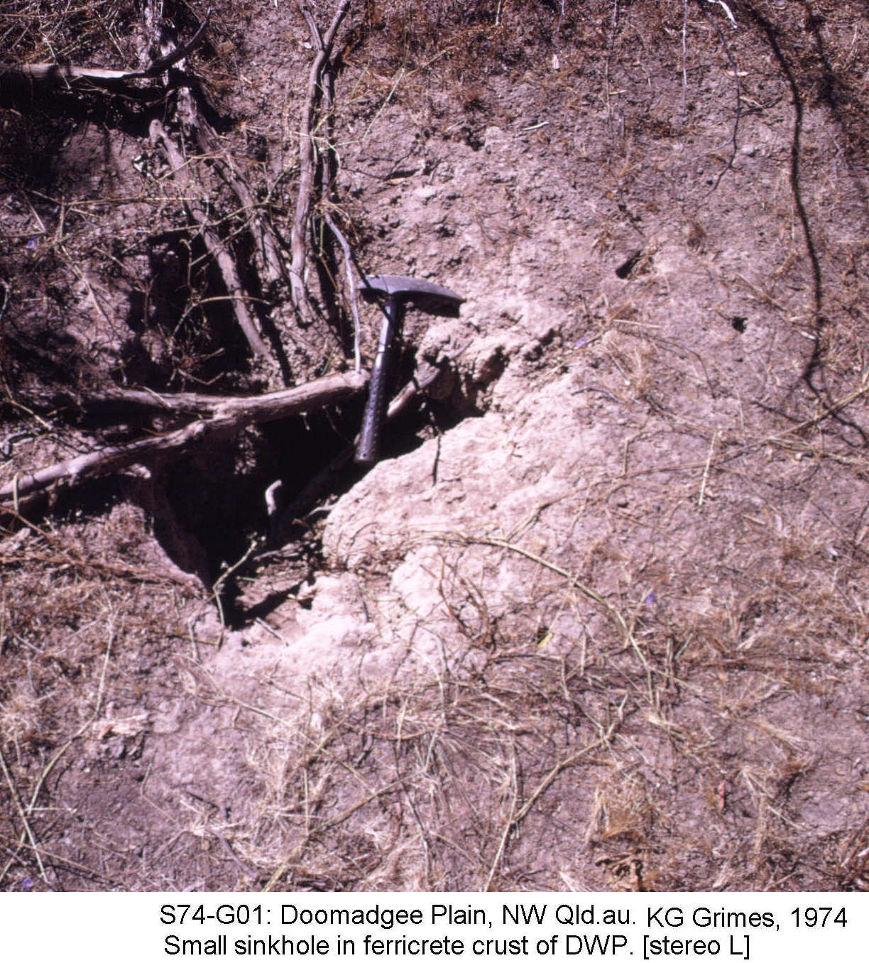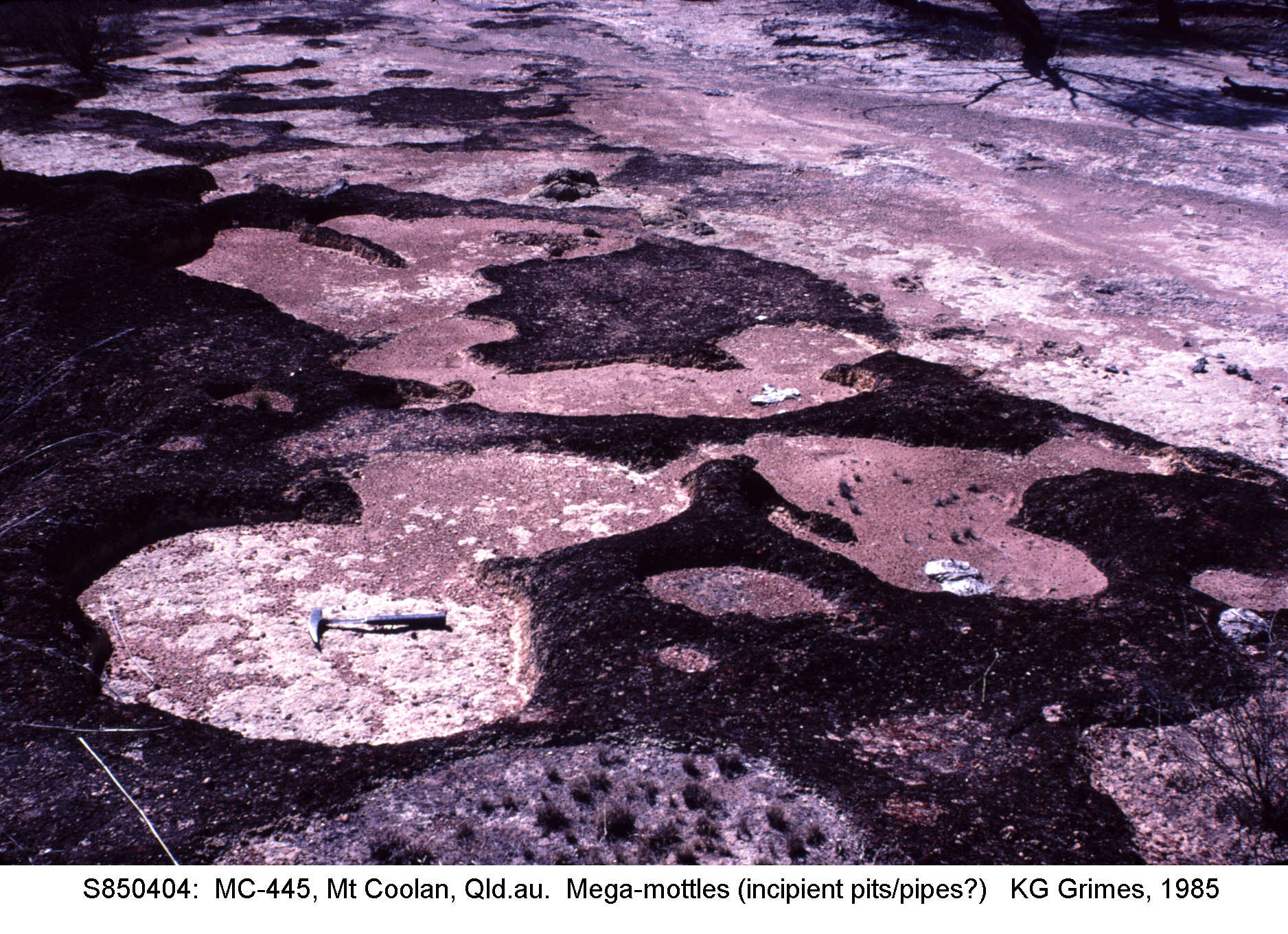 Solution dolines (pits & pipes) in a mottled DWP. The original soft soil cover has been removed. Mystery Craters, Bundaberg, Qld. S771125.JPG |