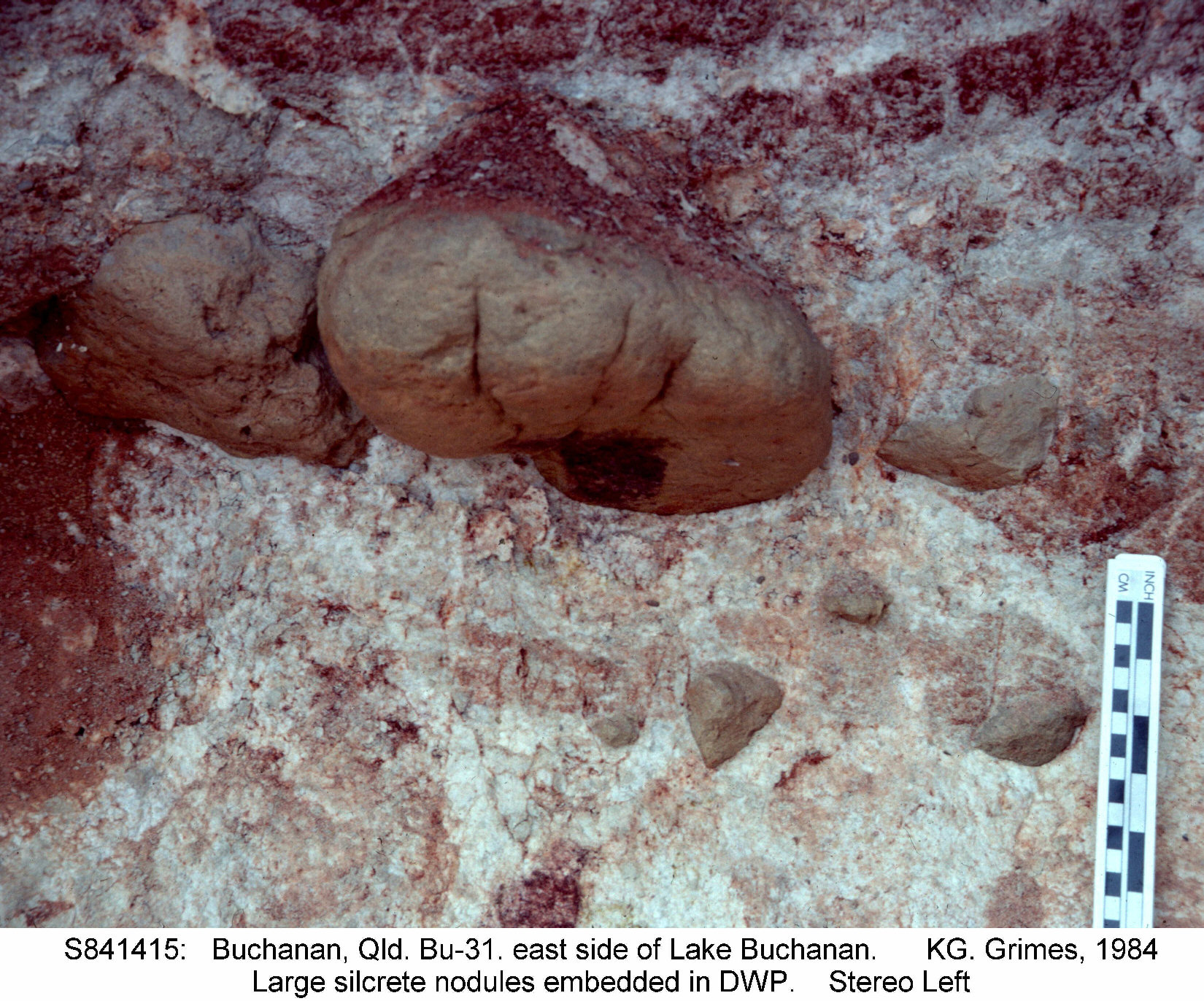 Large nodules of silcrete embedded in a DWP. The host rock is a siltstone - these are NOT transported cobbles. Lake Buchanan, Qld. Stereopair - view cross-eyed. S841414.jpg and S841415.jpg |
