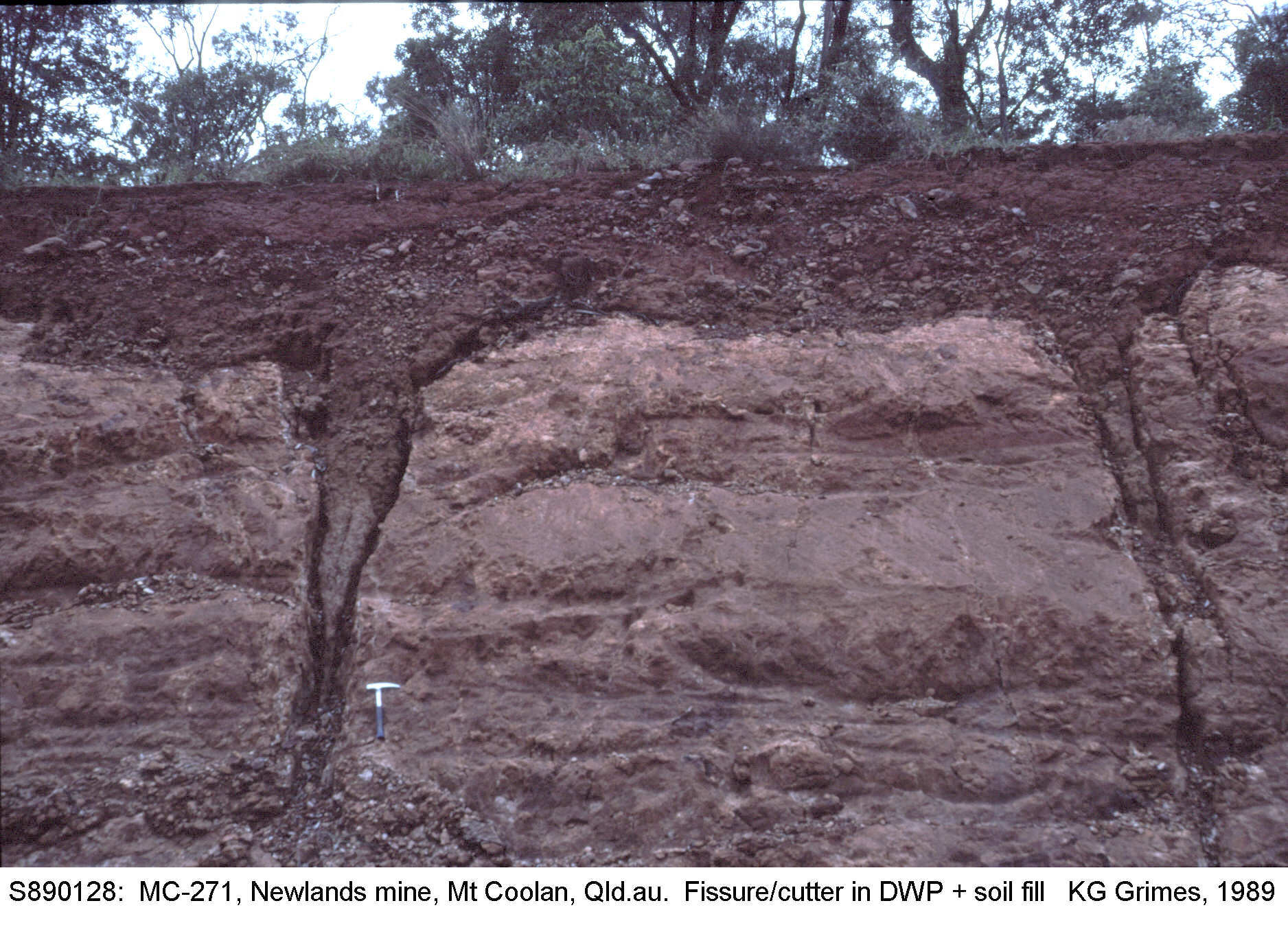 Cutters in a DWP, infilled by a younger(?) surface soil. Exposed in a mine cut, Mt. Coolon region, Qld. Cutters are subsoil fissures (enlarged joints), They are not commonly seen, but large-scale sets may be responsible for the "stone cities" of tropical Australia (see Large-scale features).