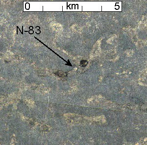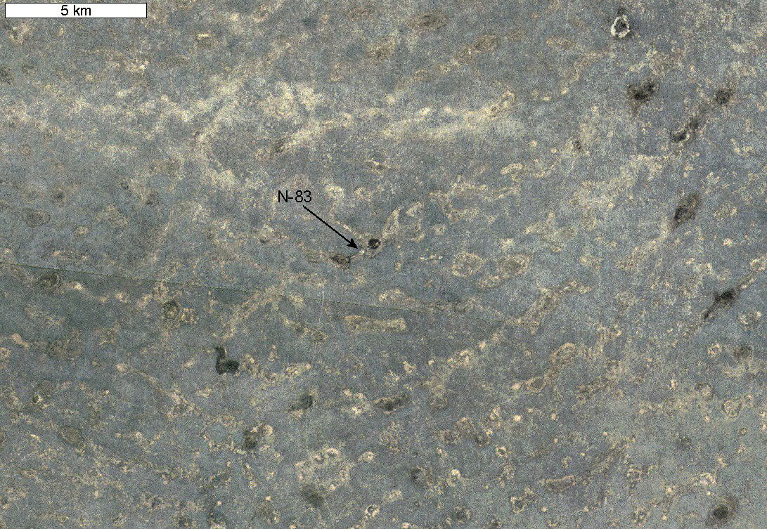 Landsat image of the central Nullarbor Plain in the vicinity of Old Homestead Cave (6N-83). Even grey is saltbush on broad rises, pale & darker patches are shallow "dambo" hollows. Click the image to see a broader view 6N83.at.jpg |