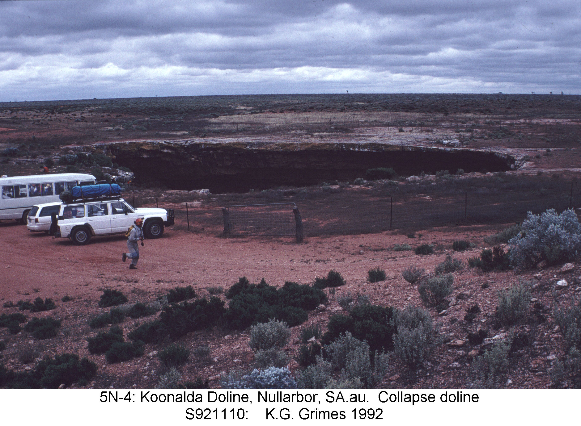 Collapse Dolines are found only in the southern part of the plain, mostly within 60 km of coast. These are large, deep, and steep sided, and connect to caves at various depths, including the deep systems. [PHOTO Koonalda]