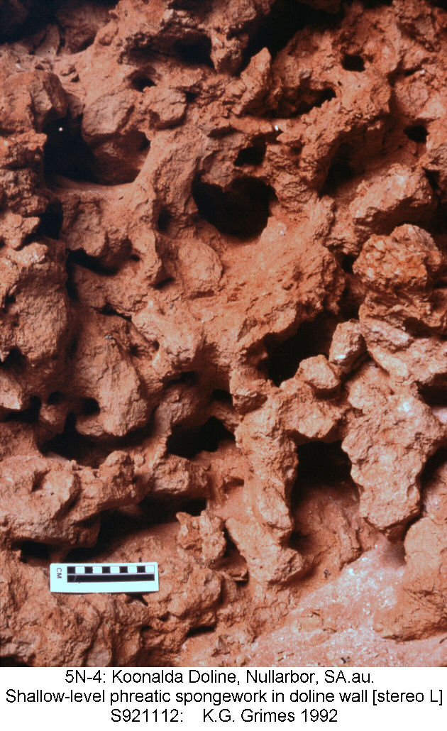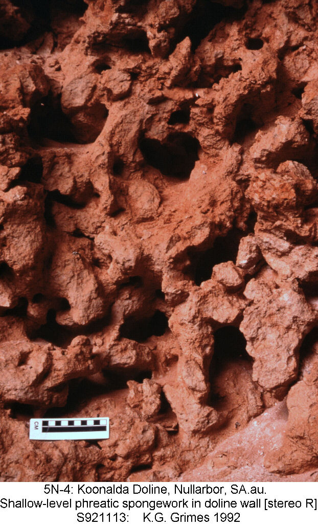 This near-surface spongework was thought to be phreatic and dating from past higher watertables, but James et al (2005) and Webb & James (2006) suggest that it could be a recent vadose effect resulting from the rare rain storms. Within the spongework zone there are many shallow caves. At greater depth, but still above the present watertable are larger systems such as Old Homestead Cave (with ~30 km of passage) and Thampanna Cave - these show extensive phreatic sculpturing.