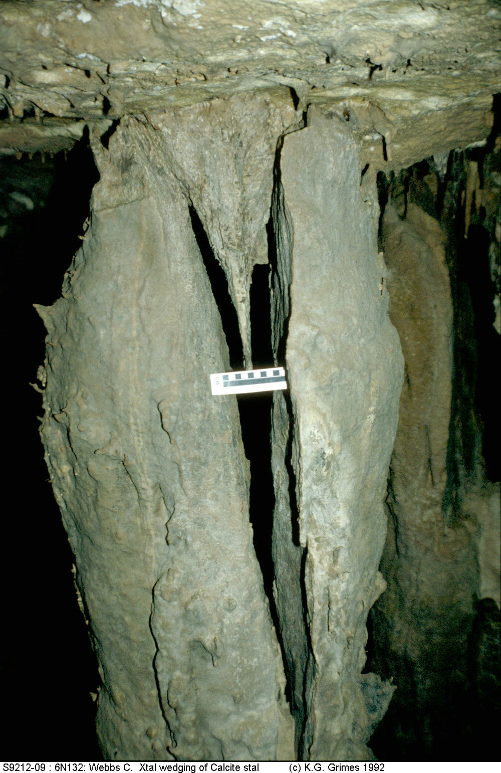 Calcite speleothem cracked open by crystal wedging. Webbs cave. S9212-09.jpg |